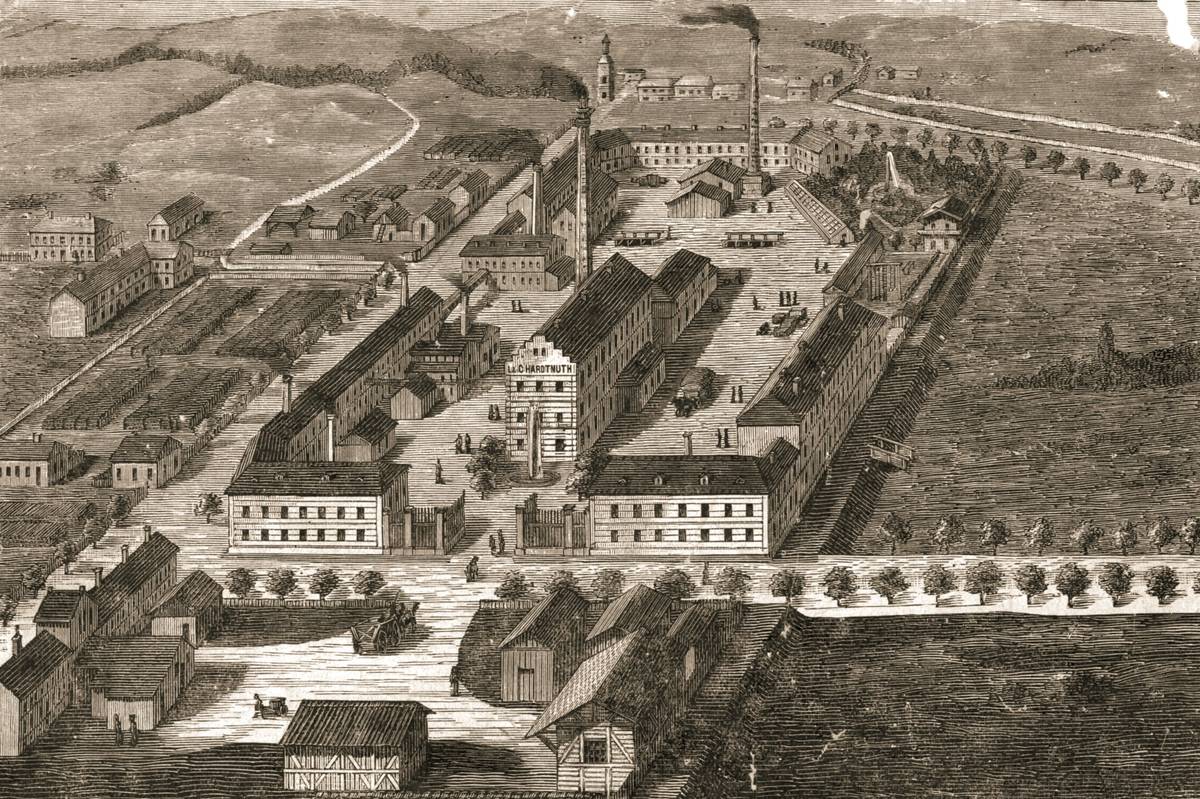 Koh-i-noor Hardtmuth. Továrna Koh-i-noor v Českých Budějovicích - rytina z roku 1914. Přesný název společnosti v té době zněl: KOH-I-NOOR tužkárna L. & C. HARDTMUTH.