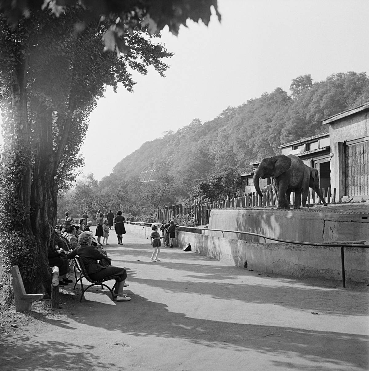 čtk: zoo Praha na historických fotkách / Zoologická zahrada Praha - návštěvníci před sloním výběhem. 10.09.1956