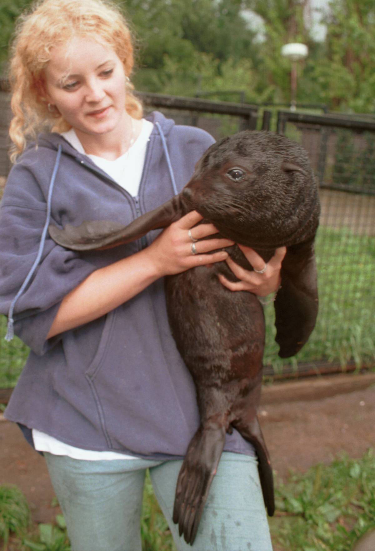 čtk: zoo Praha na historických fotkách / Zoologická zahrada Praha - mládě - lachtan jihoafrický. Ošetřovatelka v pražské ZOO ukazuje malého lachtana jihoafrického. 21.07.1997