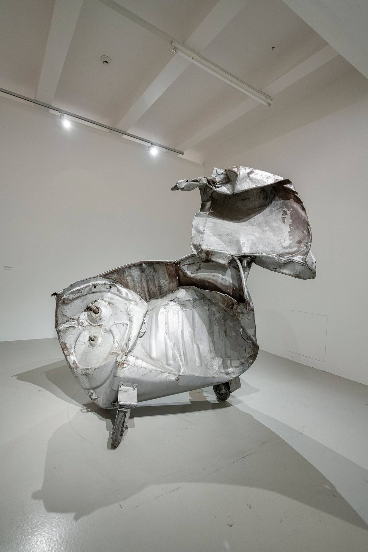 Krištof Kintera vystavuje zmáčklou plechovou popelnici.