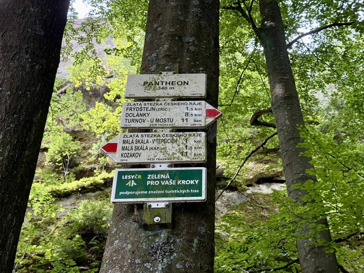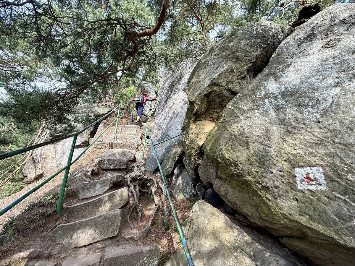 Napřed se stoupá do kopce, pak klesá po pravé straně skály.