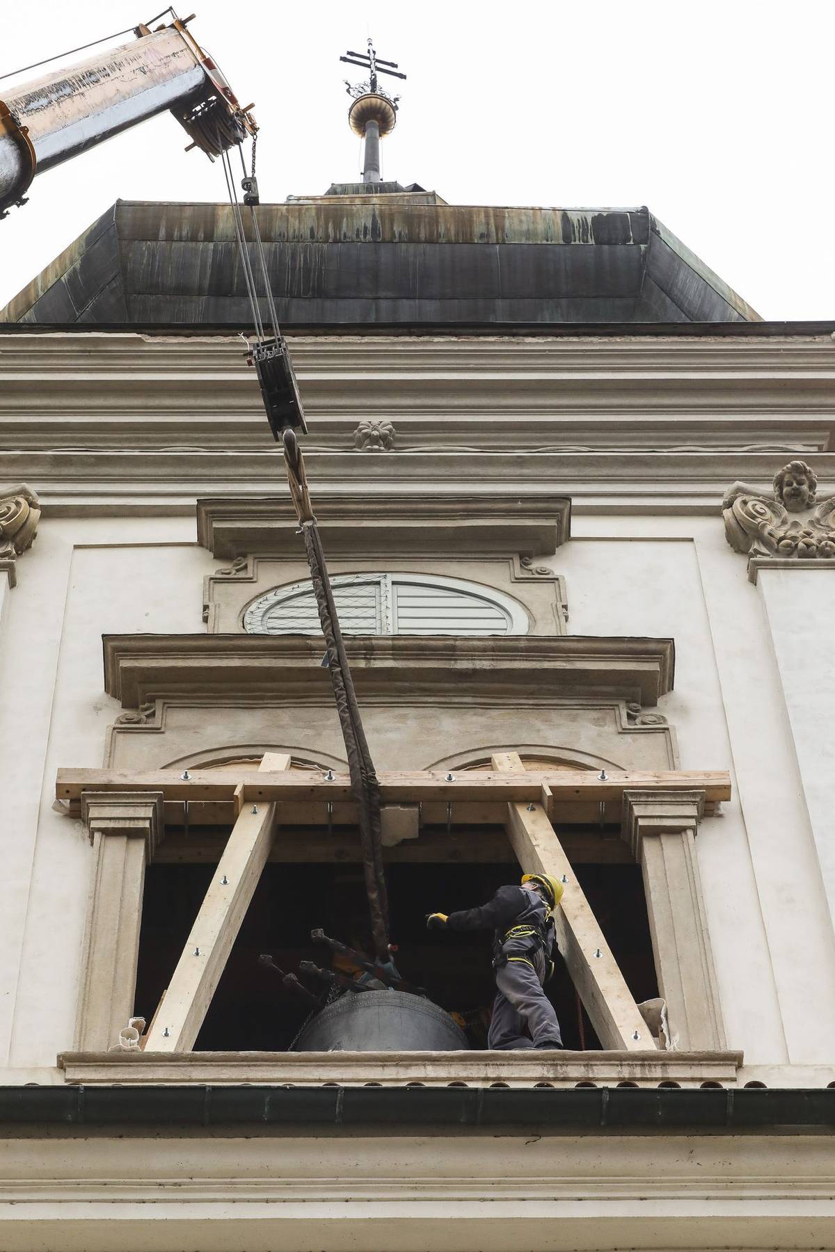 Dostat dva prasklé zvony z věže dolů. Rozhodli se pro transport oknem, kvůli čemuž bylo nutné už předtím probourat středový sloupek.