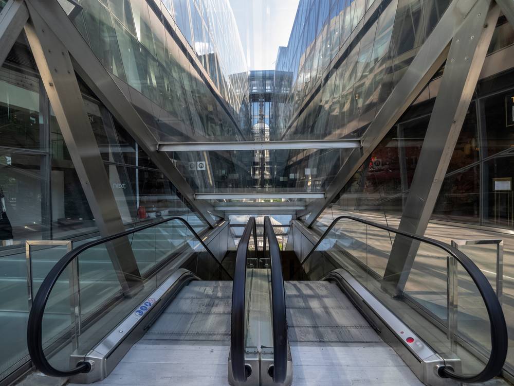 Prázdné jezdící schody u pasáže New Change poblíž katedrály svatého Pavla. Opět místo, kde obvykle panuje čilý ruch, zvlášť po poledni, kdy z budov, v nichž sídlí stovky firem, vyběhnou lidé na oběd. Snímek z 12:15, 6. května 2020.