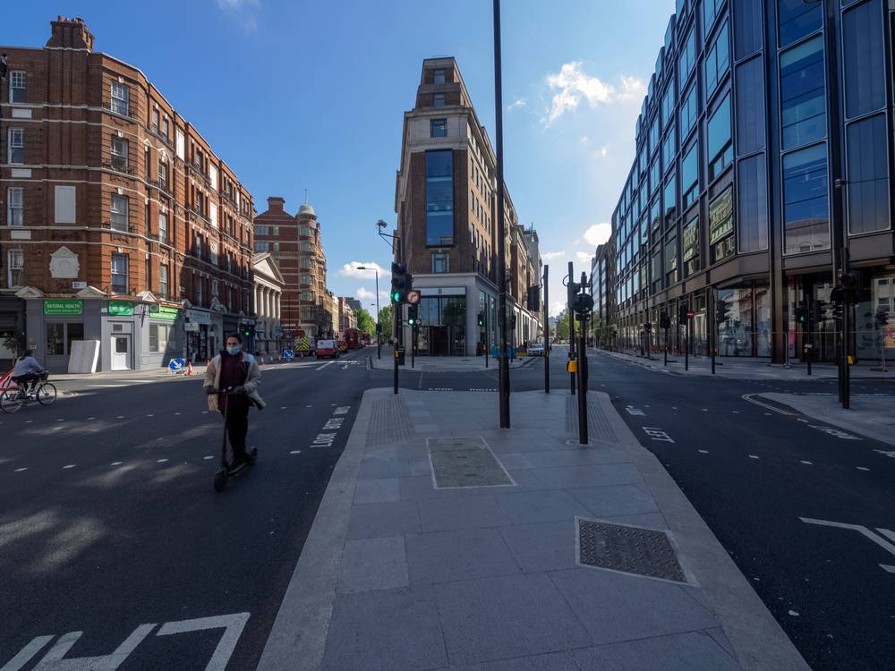 Čas oběda na pomezí New Oxford Street a Bloomsbury Way Junction, 6. května 2020.