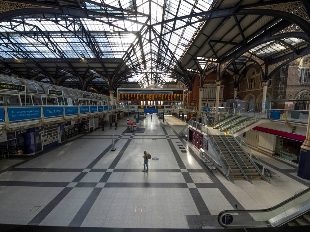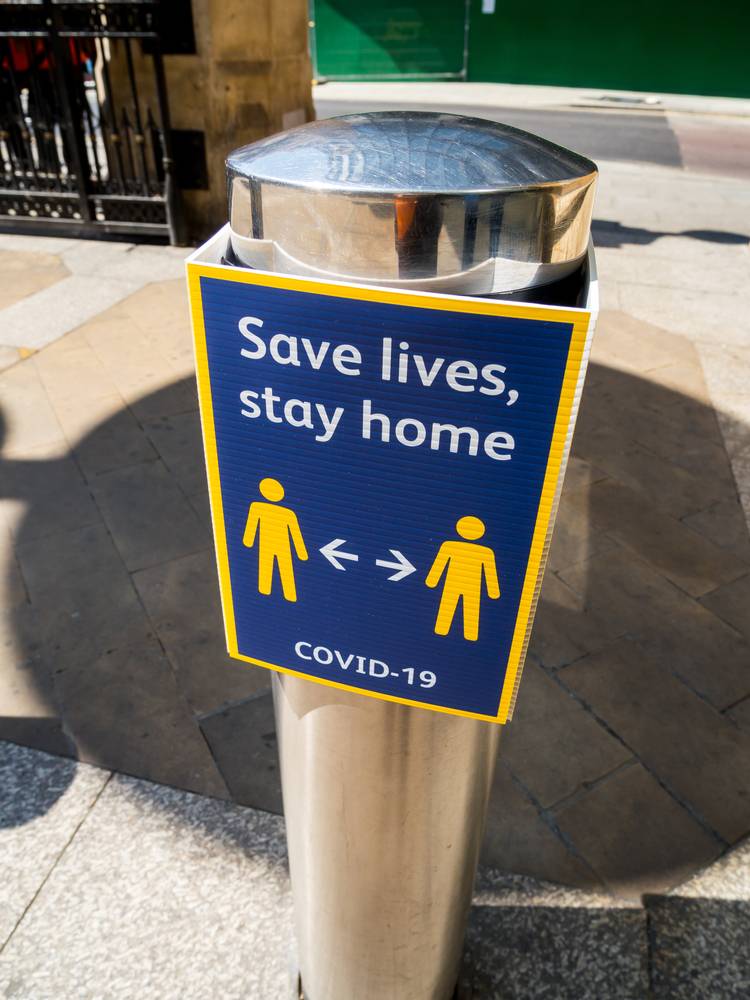 Zachraňte životy, zůstaňte doma. Plakátek u stanice Liverpool, 7. května 2020.