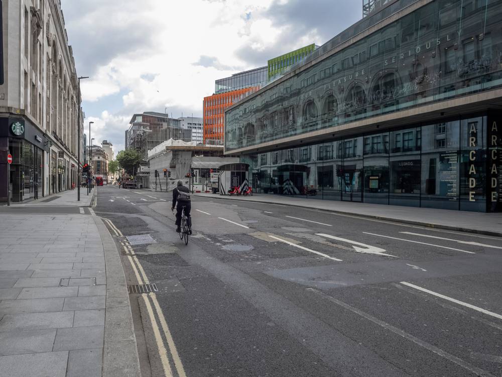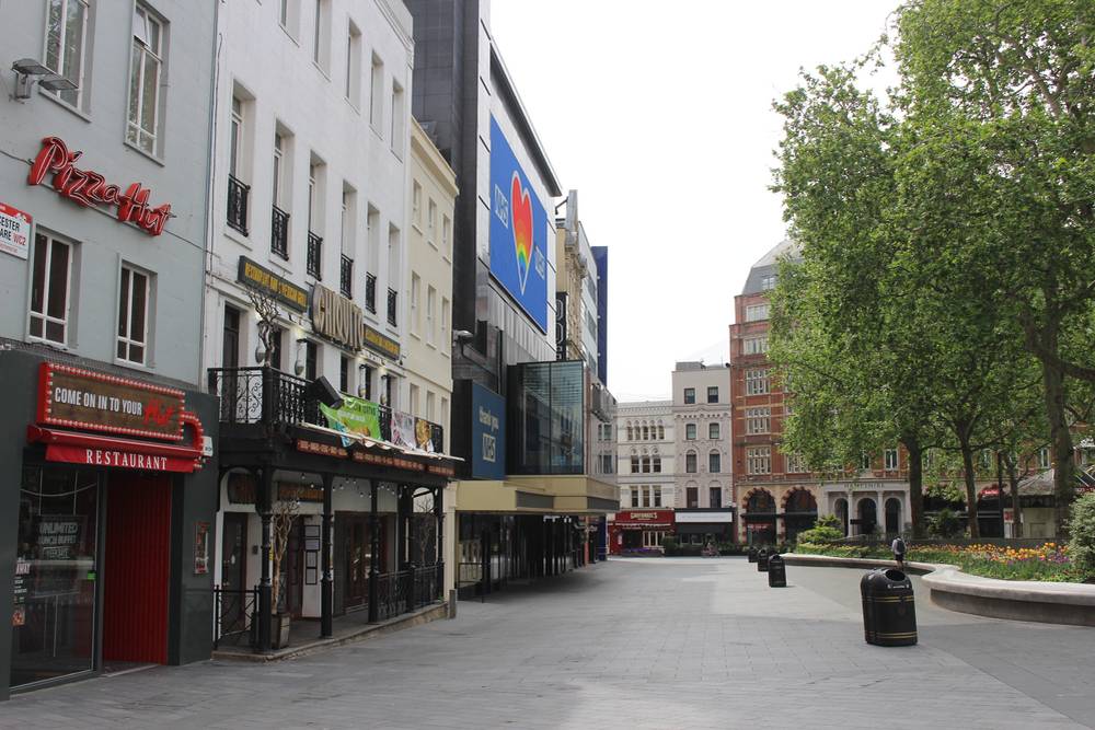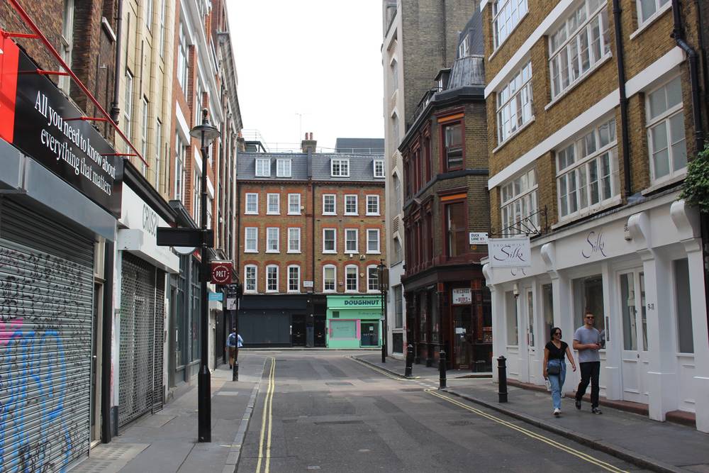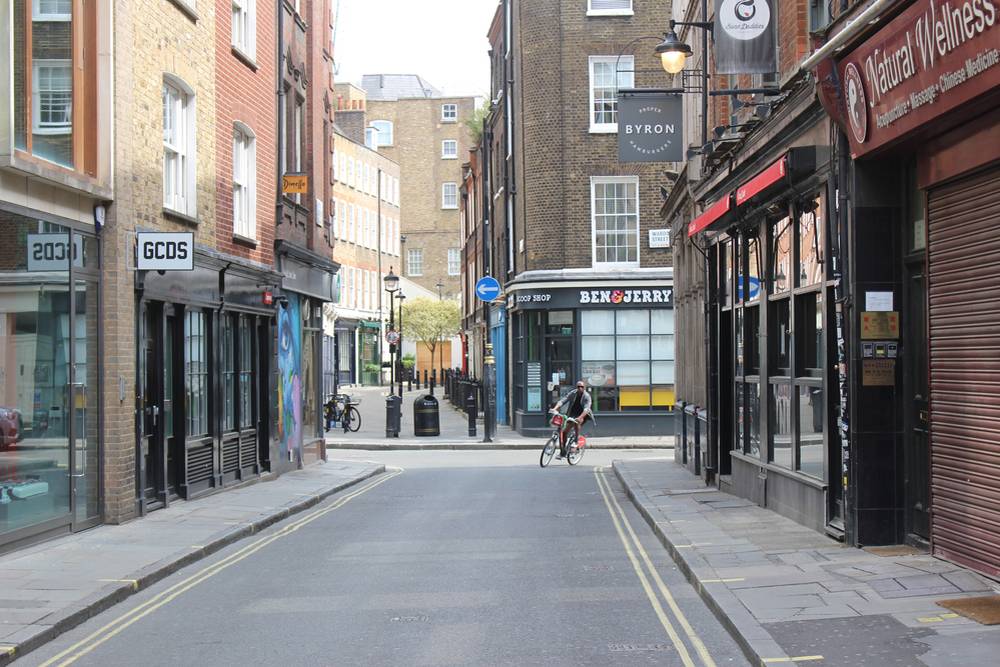 Obyvatelé Británie zažívají už osmý týden restrikcí. Původní plán ministerského předsedy Borise Johnsona nechat populaci promořit padl poté, co nemocnice přestaly zvládat počty nakažených. Snímek z jindy rušné Lexington Street z 8. května 2020.