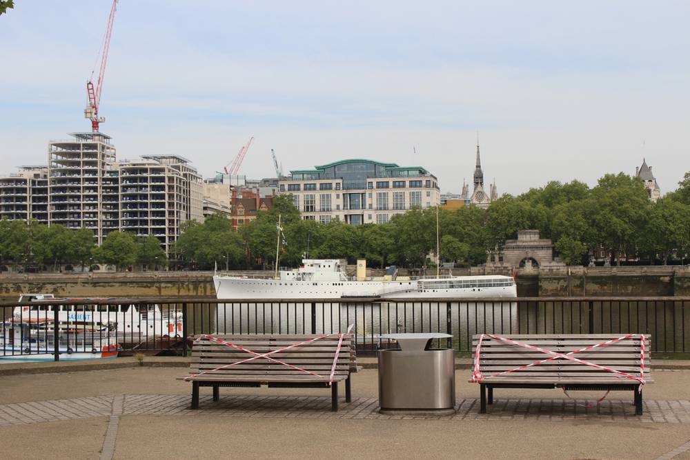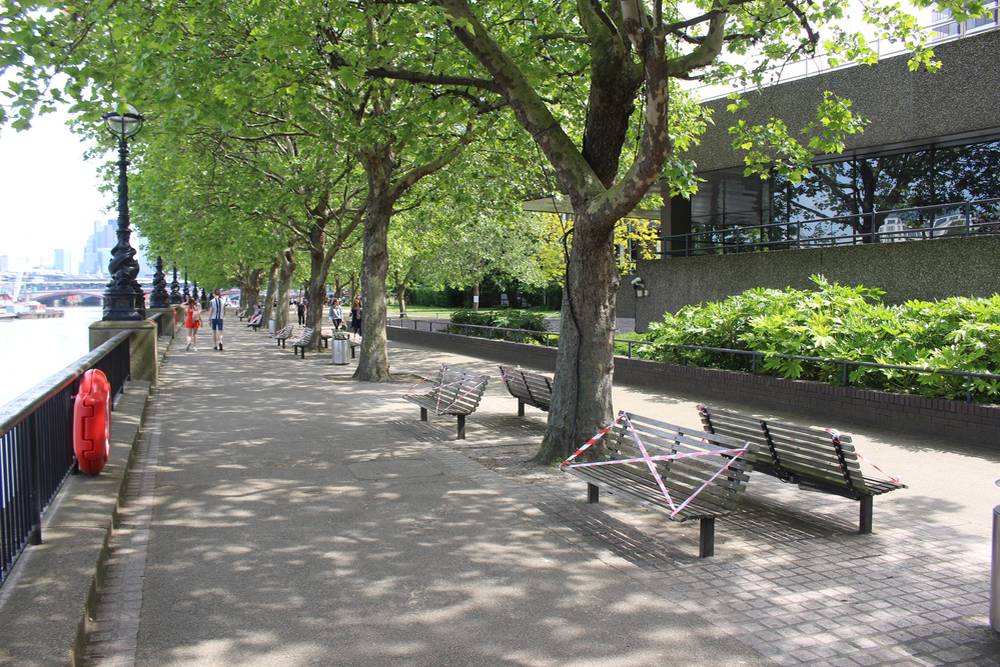 A další lavičky opatřené páskou. Southbank, 8. května 2020.