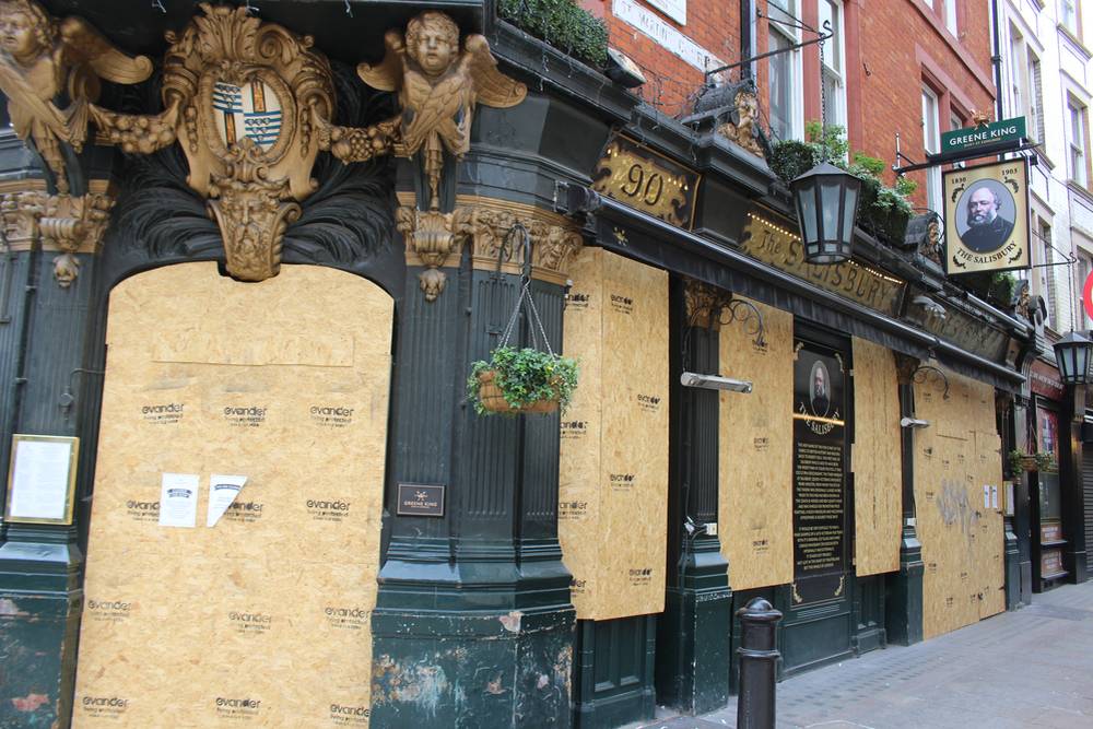 Zabedněný pub v Covent Garden, 8. května 2020. Hospody se podle Borise Johnsona jen tak neotevřou. Bylo by prý „šílenstvím“ odčinit dosavadní úspěchy v potlačení epidemie covidu-19 „umožněním druhého vrcholu“.