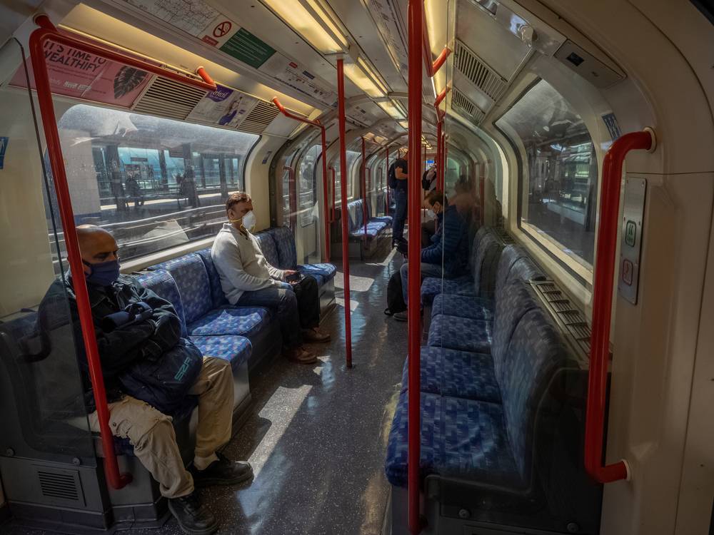 Veřejnou dopravu teď využívá skutečně jen hrstka lidí. Snímek byl pořízen na Central Line u zastávky Stratford 6. května 2020.