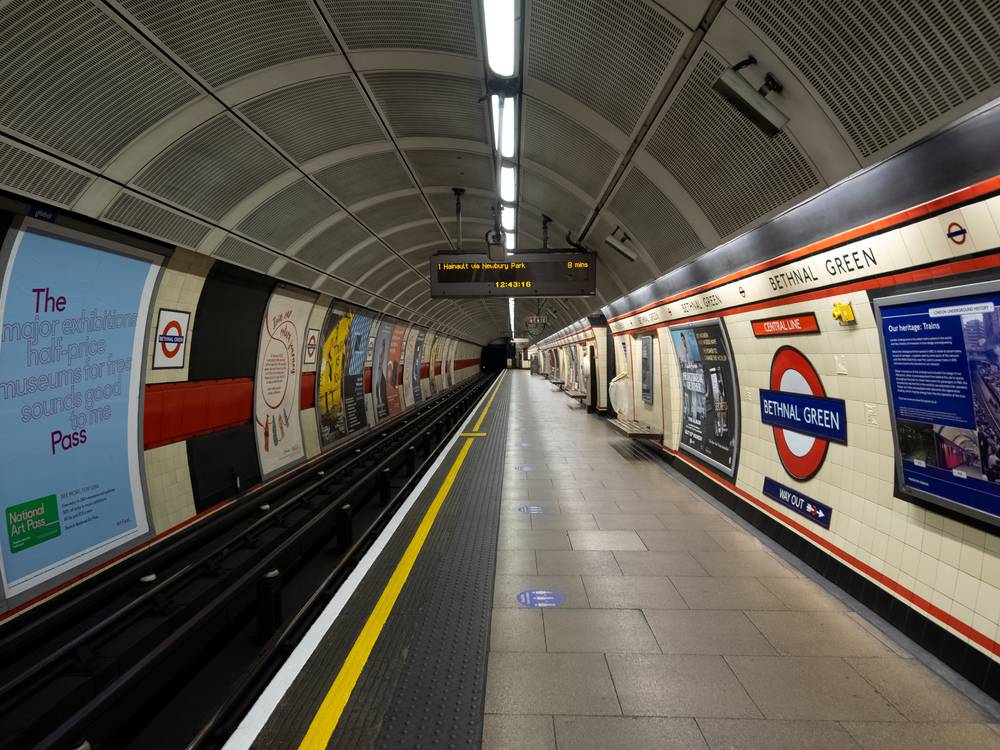 Nástupiště metra ve stanici Bethnal Green krátce po poledni 10. května 2020.