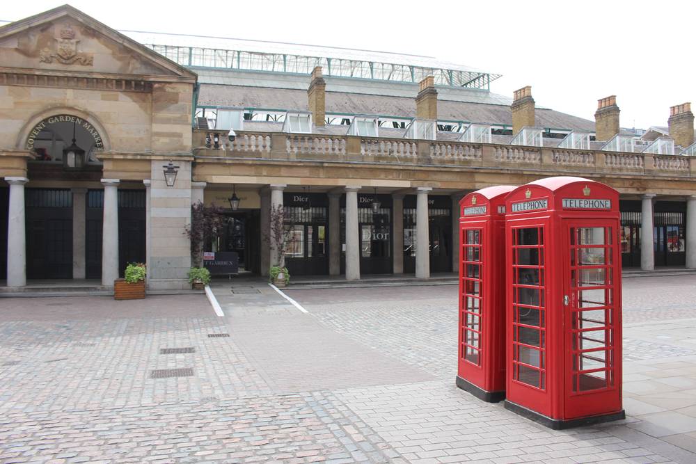 Ikonické červené telefonní budky před prázdnou Covent Garden. 8. května 2020.