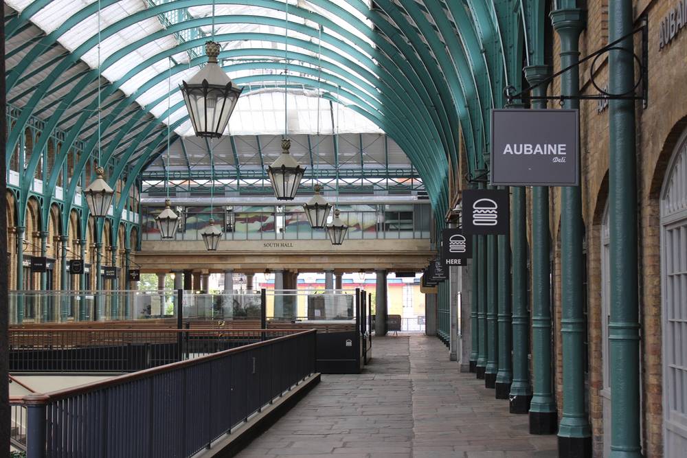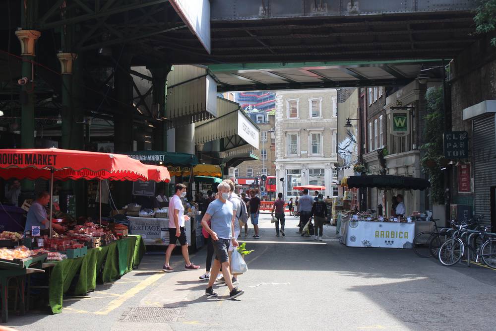 Borough Market v Southwarku patří k největším a nejstarším tržnicím města. Během karanténních opatření tu nakupuje jen hrstka lidí. 8. května 2020.