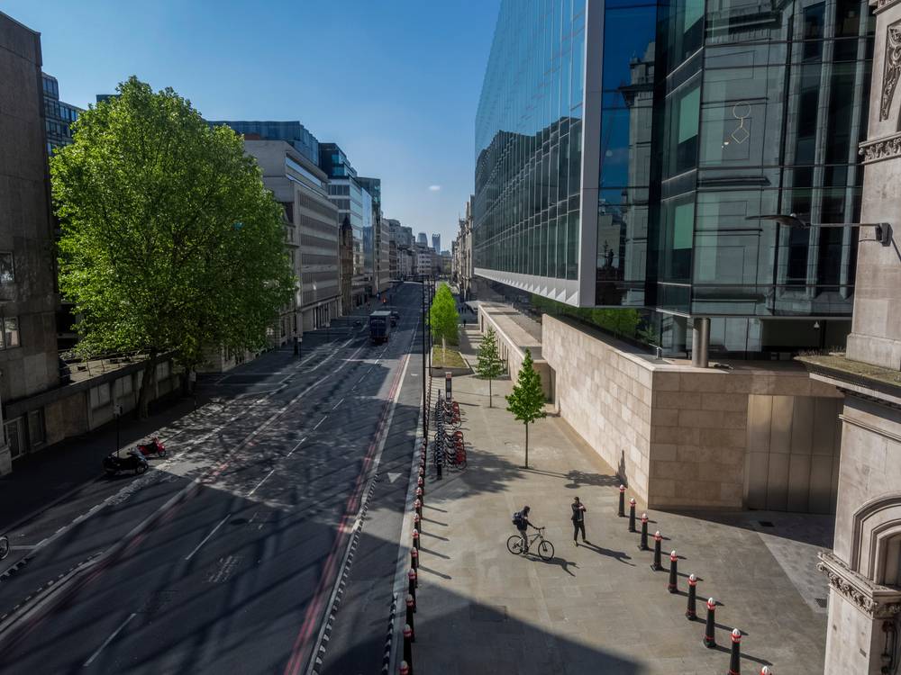 Pro zaměstnavatele prý vláda připravuje seznam zásad ohledně zabezpečení pracovišť. Pohled na Farringdon Street od Holbornova viaduktu 6. května 2020 v 10 hodin dopoledne.