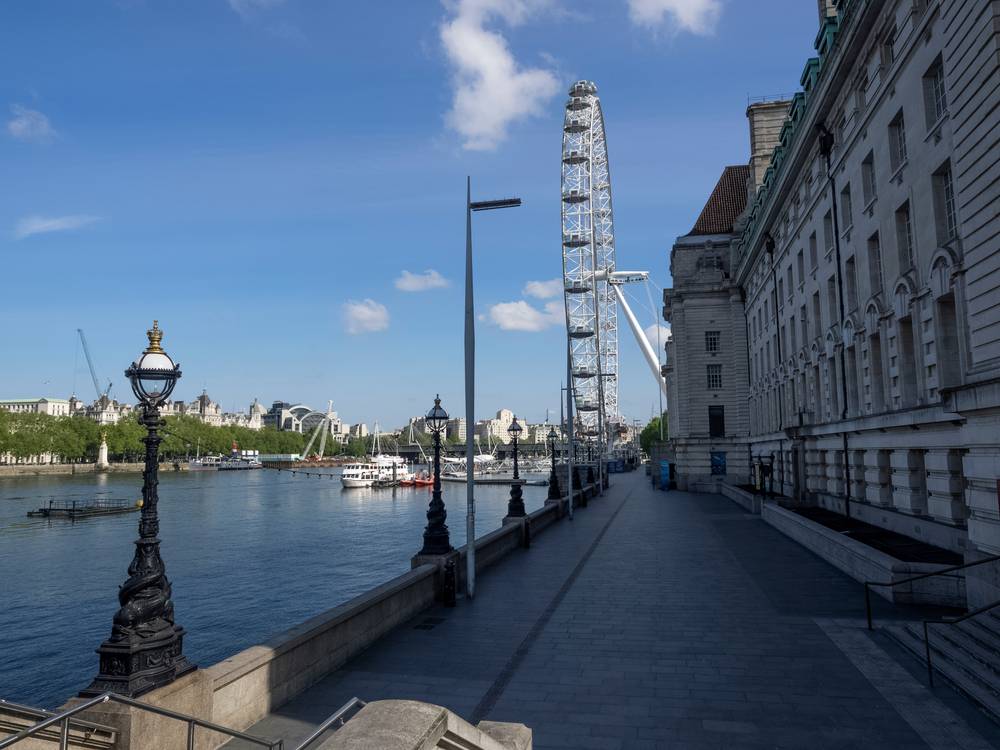 Oblíbené odpočinkové místo poblíž Londýnského Oka na břehu Temže, 4. května 2020.