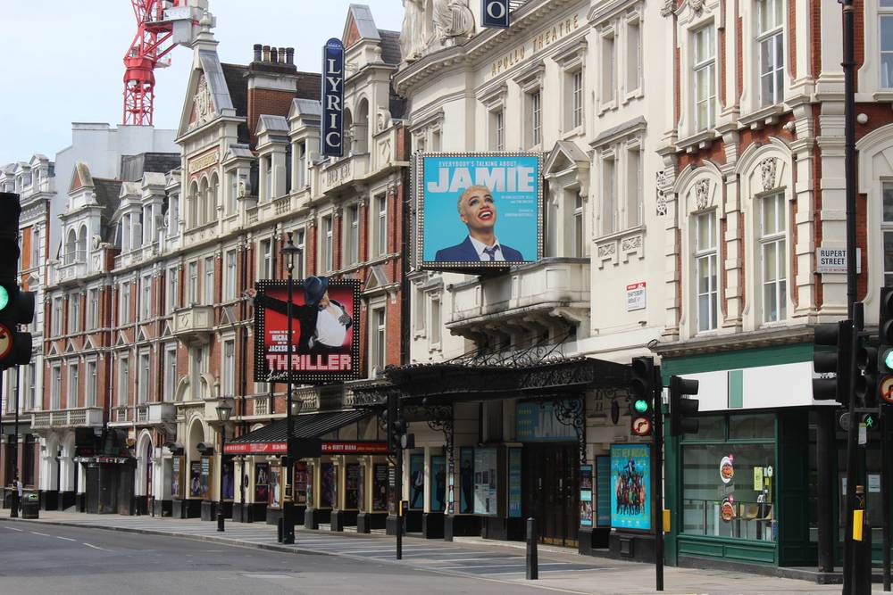 Prázdná Shaftesbury Avenue a její divadla. 8. května 2020.