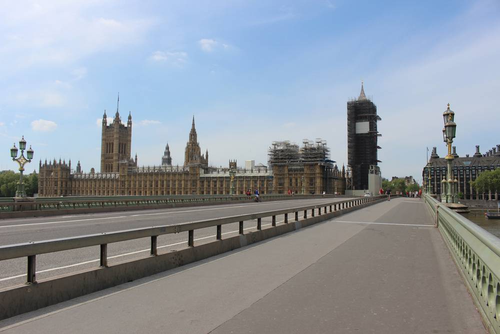 Prázdný Westminsterský most, 8. května 2020.