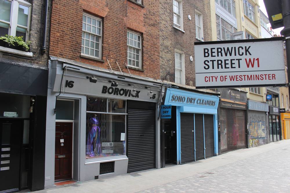 Další snímek, který ukazuje, jak se jindy pulsující čtvrť Soho změnila v tiché a prázdné místo. Berwick Street, 8. května 2020.