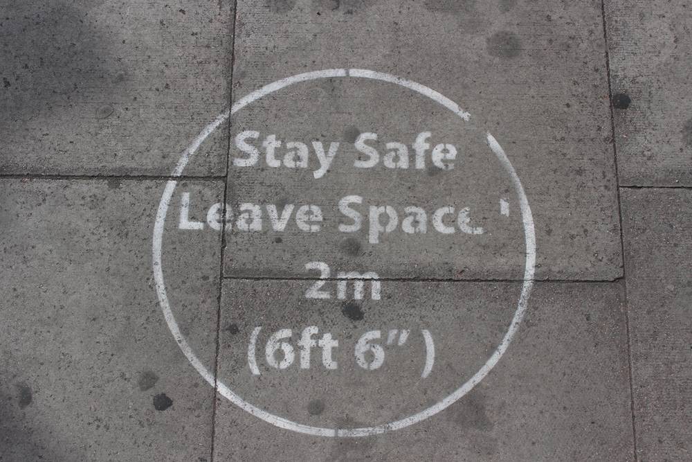 Upomínka, aby se lidé drželi na bezpečnou vzdálenost, nasprejovaná přímo na ulici. Snímek z 8. května 2020.