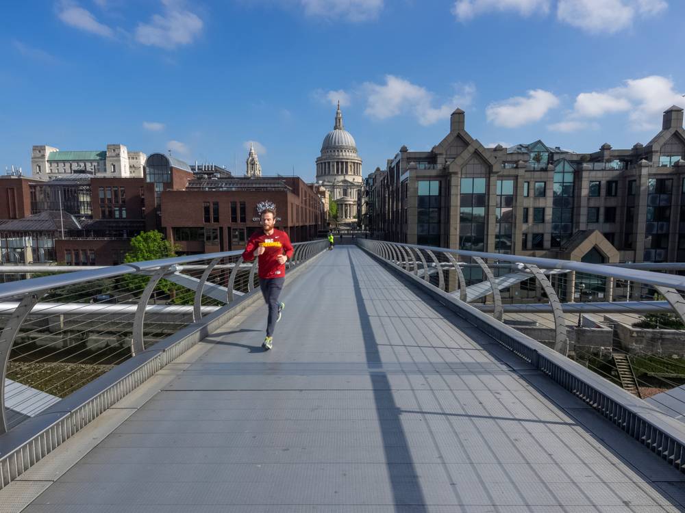 Millenium Bridge v devět hodin ráno. Obvykle se tu přes zástupy spěchajících Britů a fotících turistů dá jen těžko protáhnout. Snímek ze 6. května 2020.
