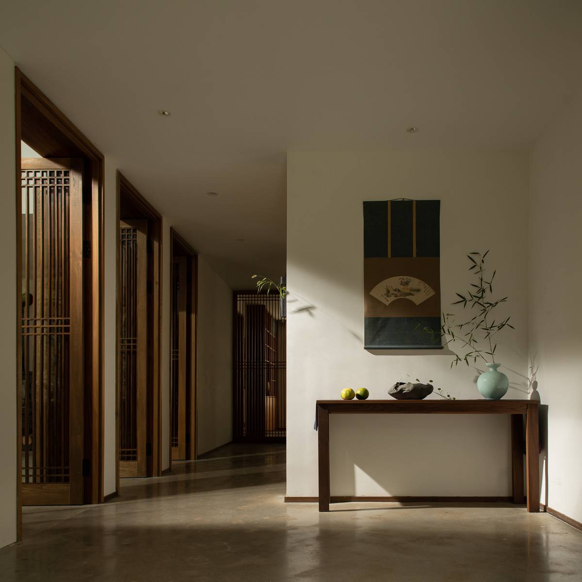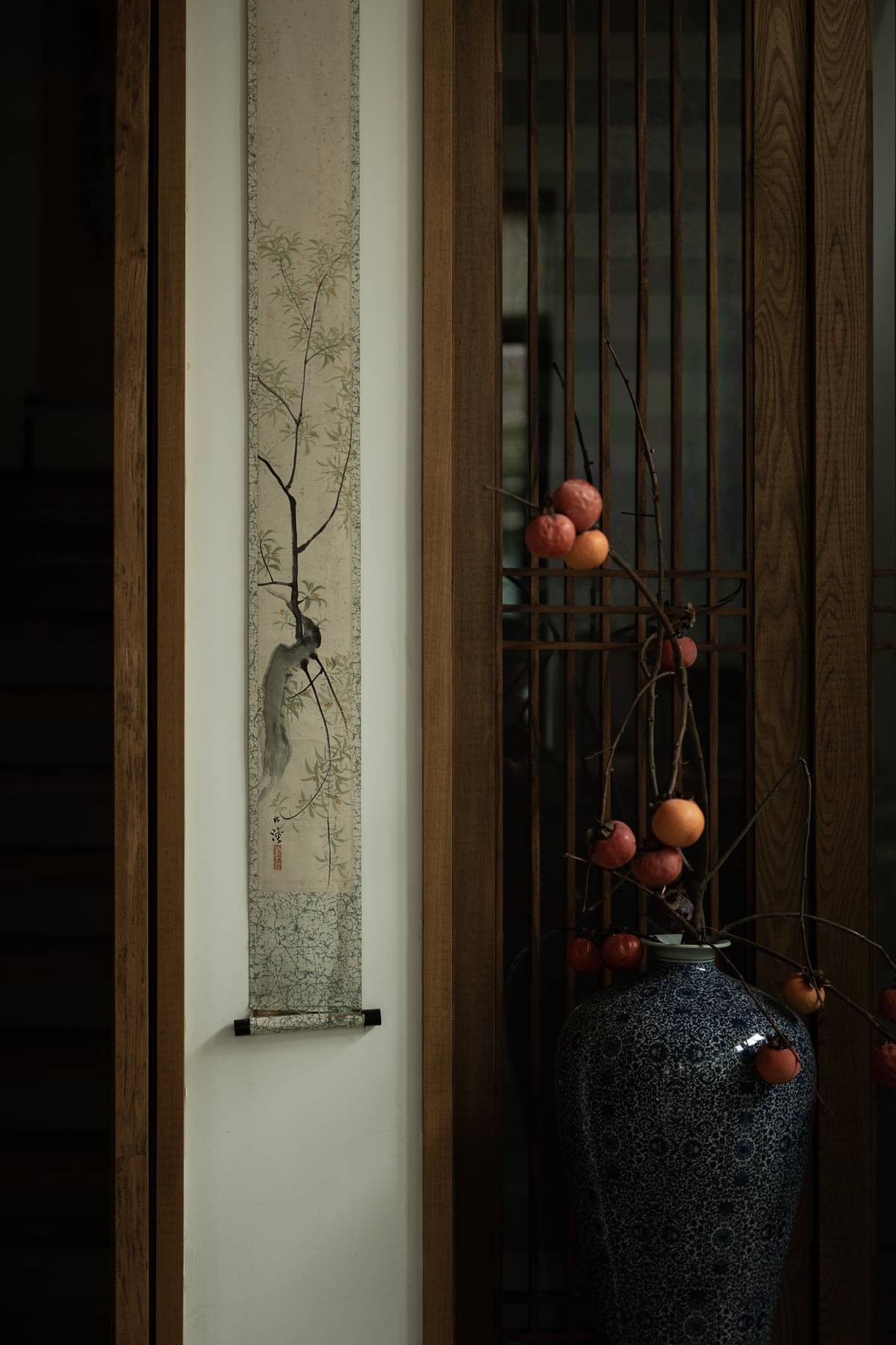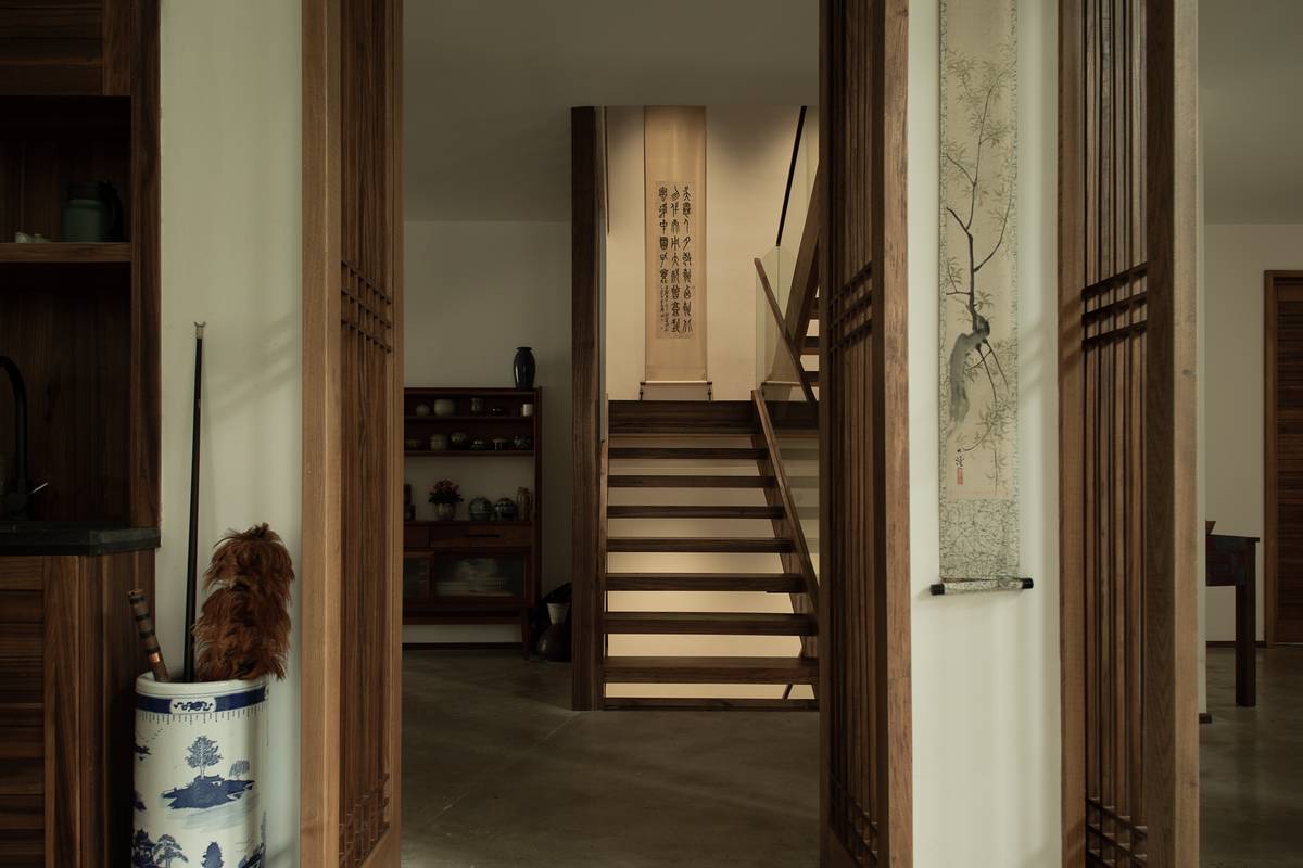 Průhled na schodiště. Stěny v tomto domě zdobí nádherné svitky s tušovými malbami a kaligrafií.