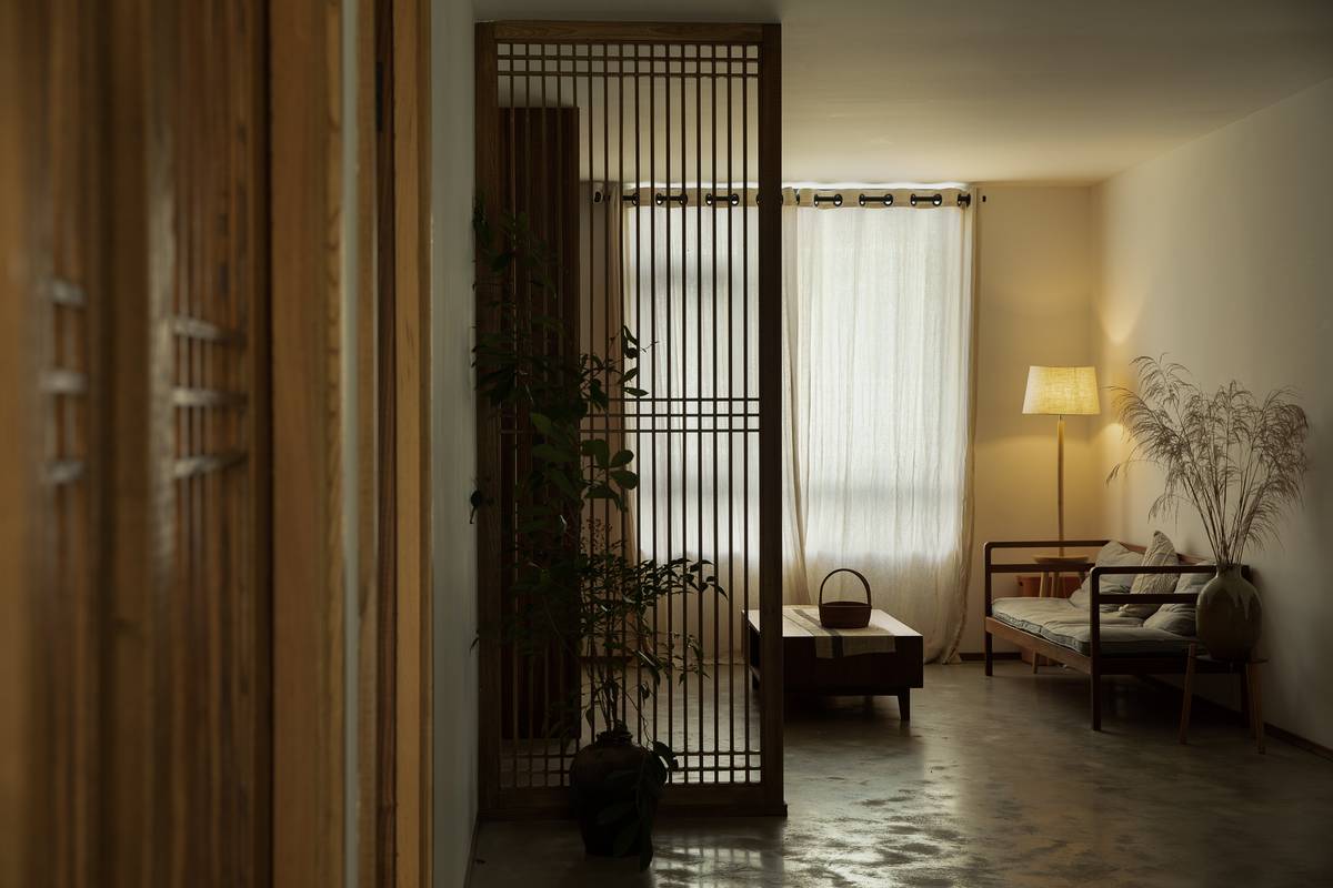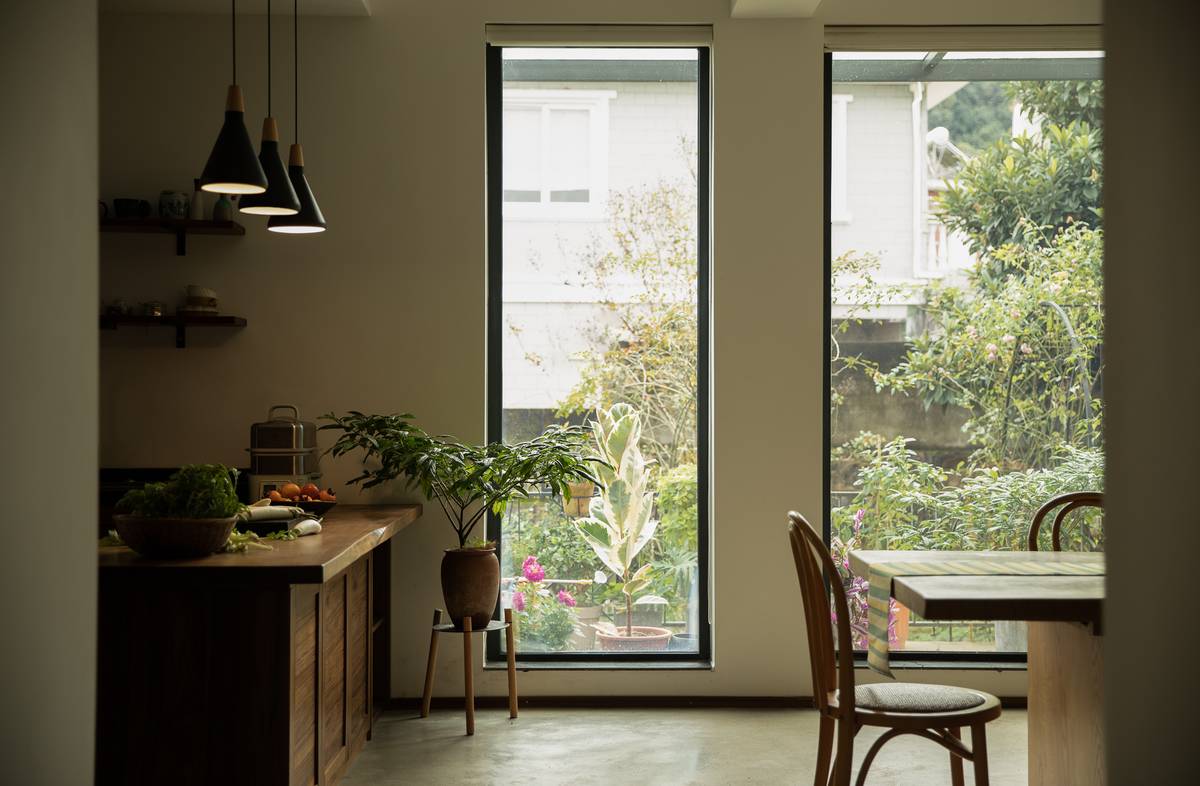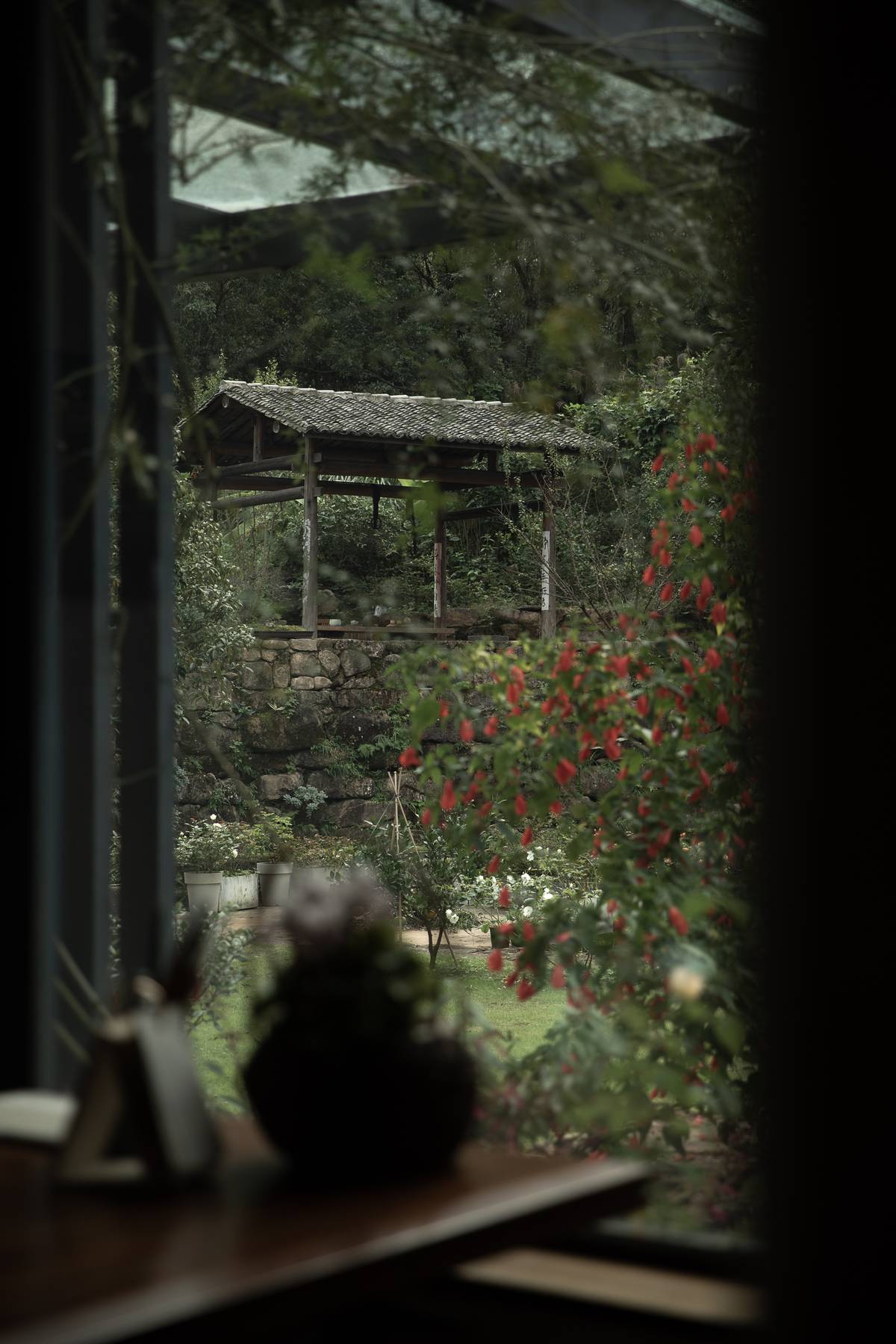 Průhled na schodiště. Stěny v tomto domě zdobí nádherné svitky s tušovými malbami a kaligrafií.