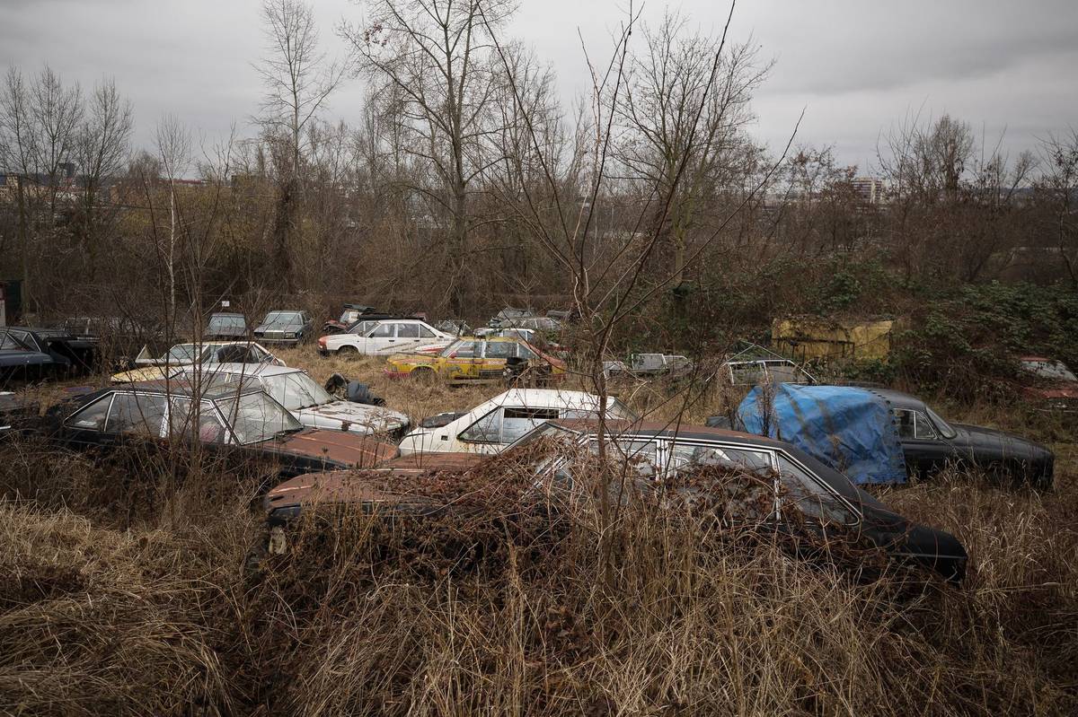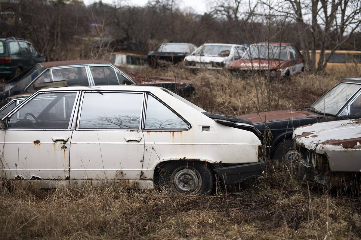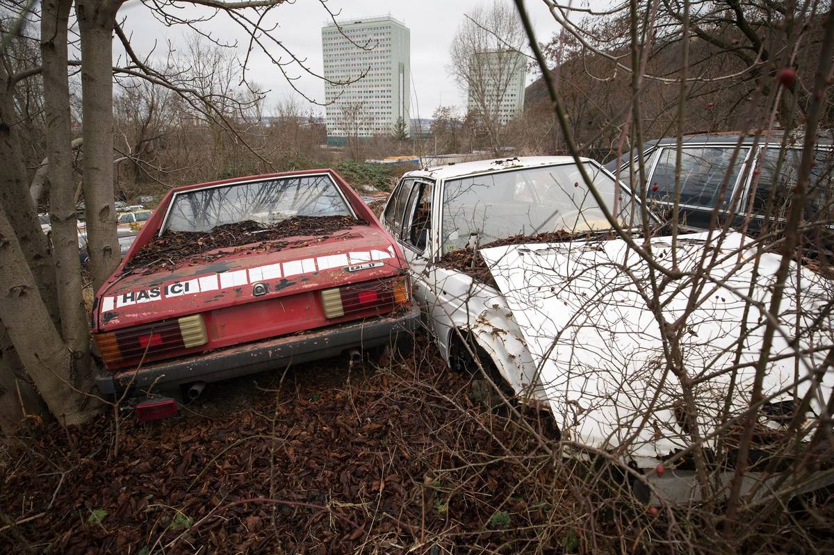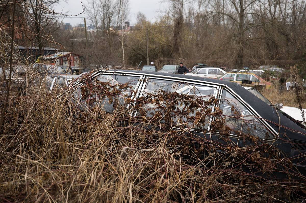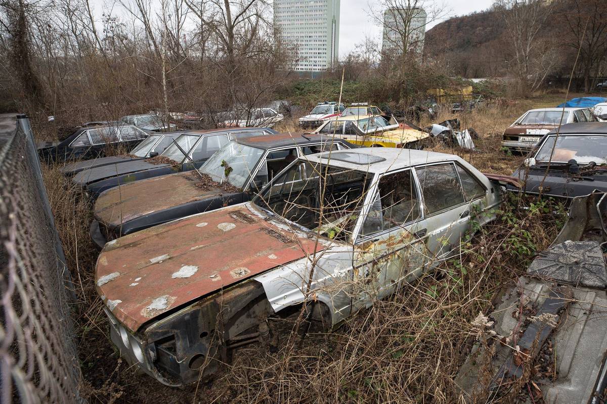 Na ploše jsou desítky odložených aut v různém stadiu rozkladu.