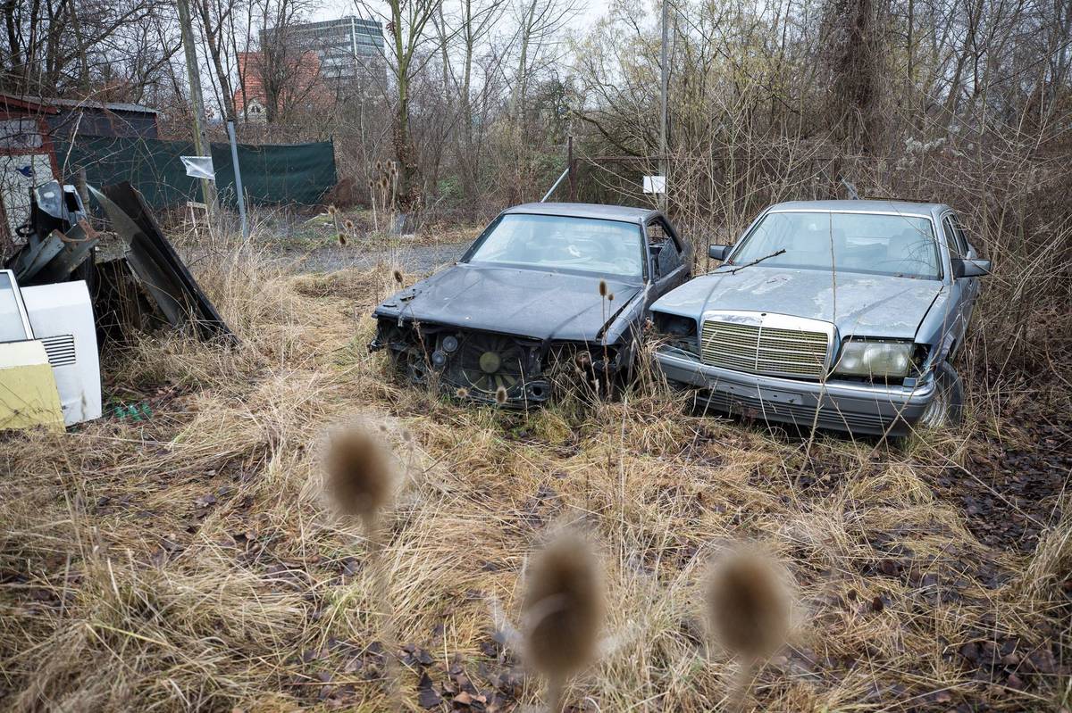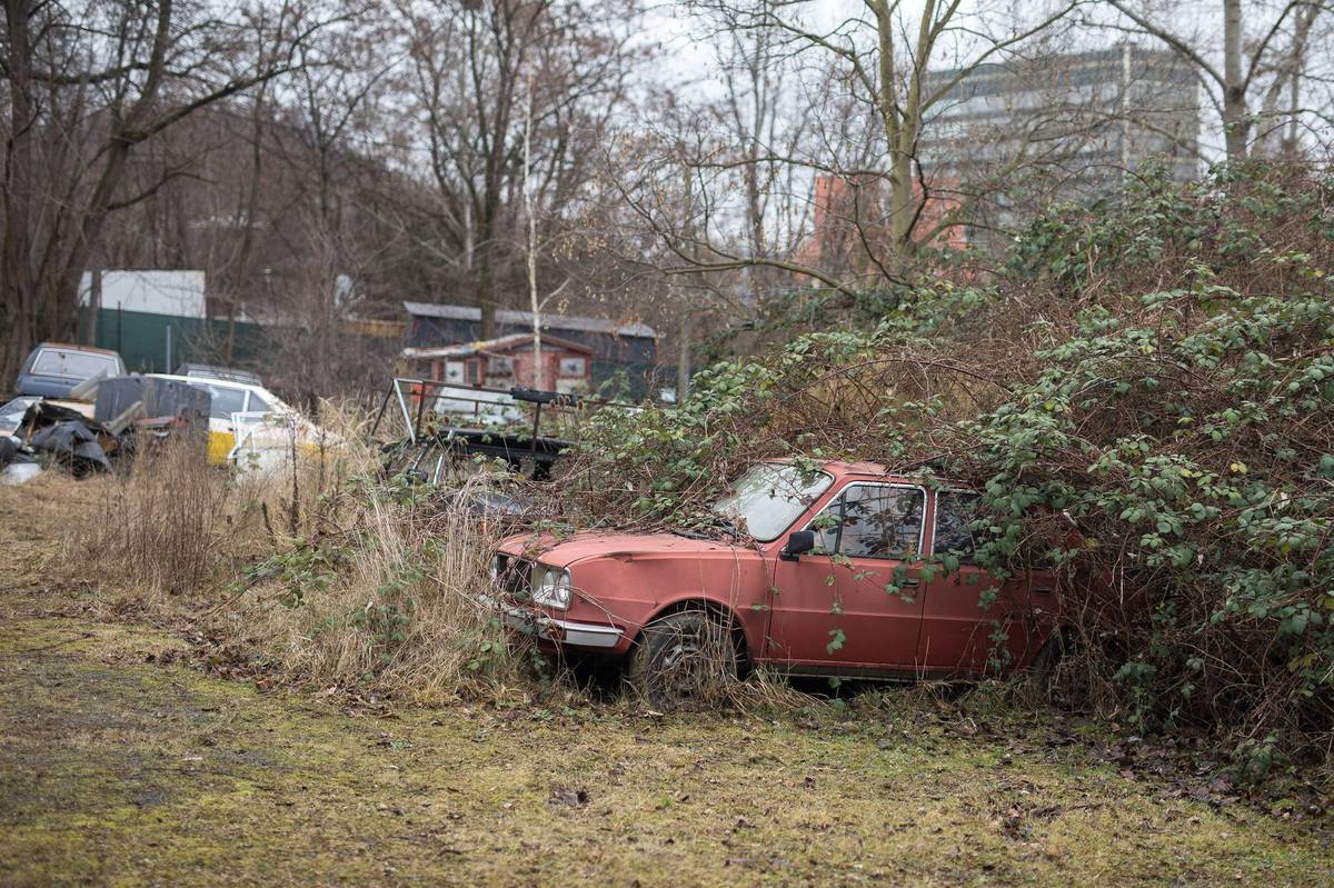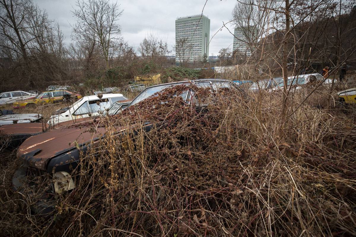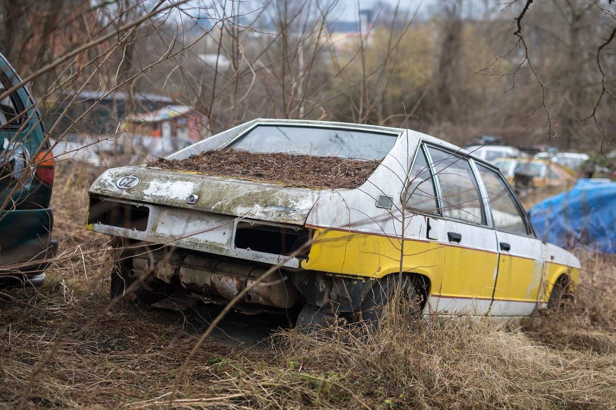 Na ploše jsou desítky odložených aut v různém stadiu rozkladu.