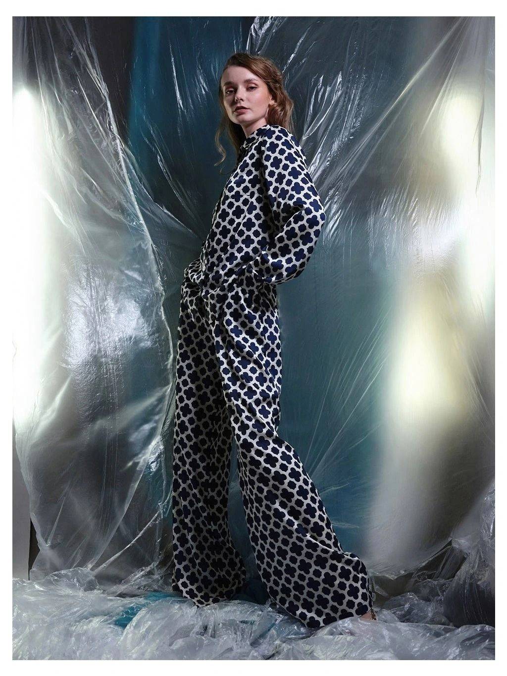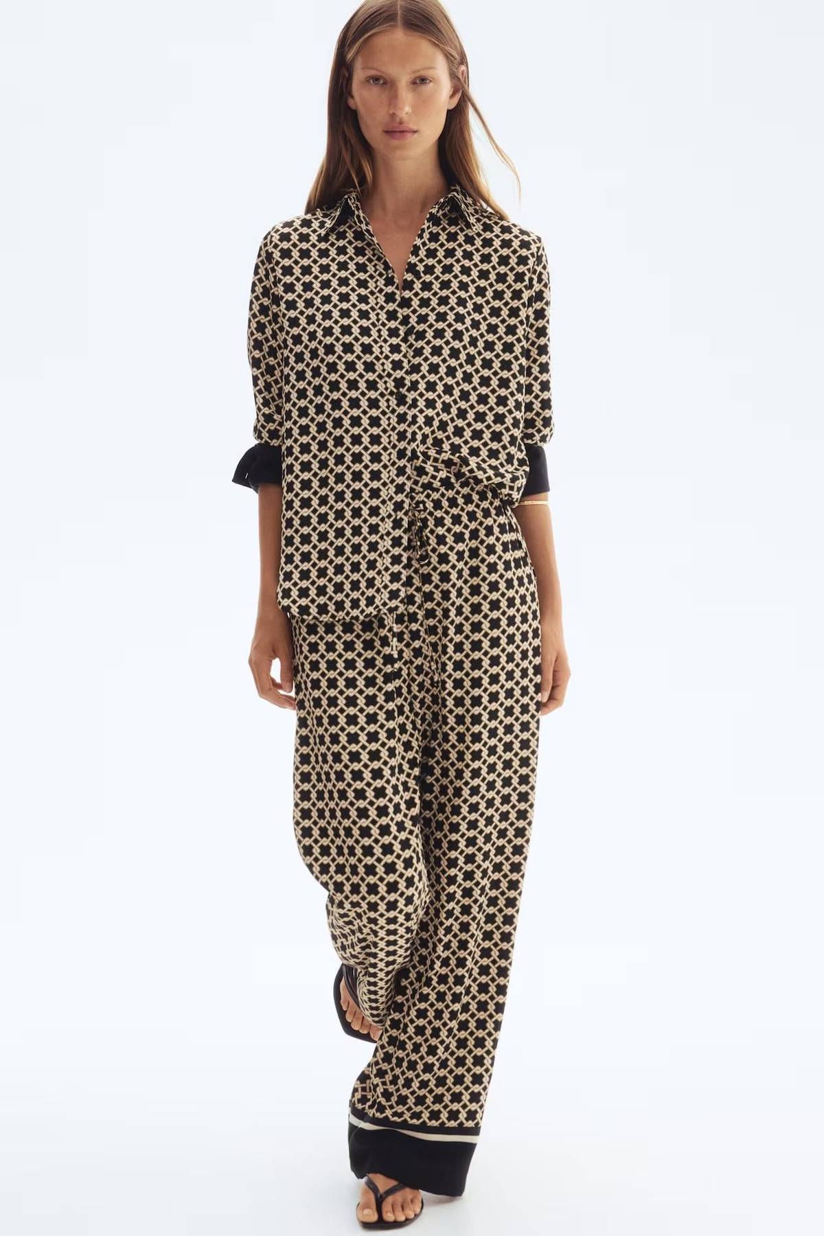 Košile s geometrickým vzorem, 899 Kč, splývavé kalhoty, 999 Kč, Mango