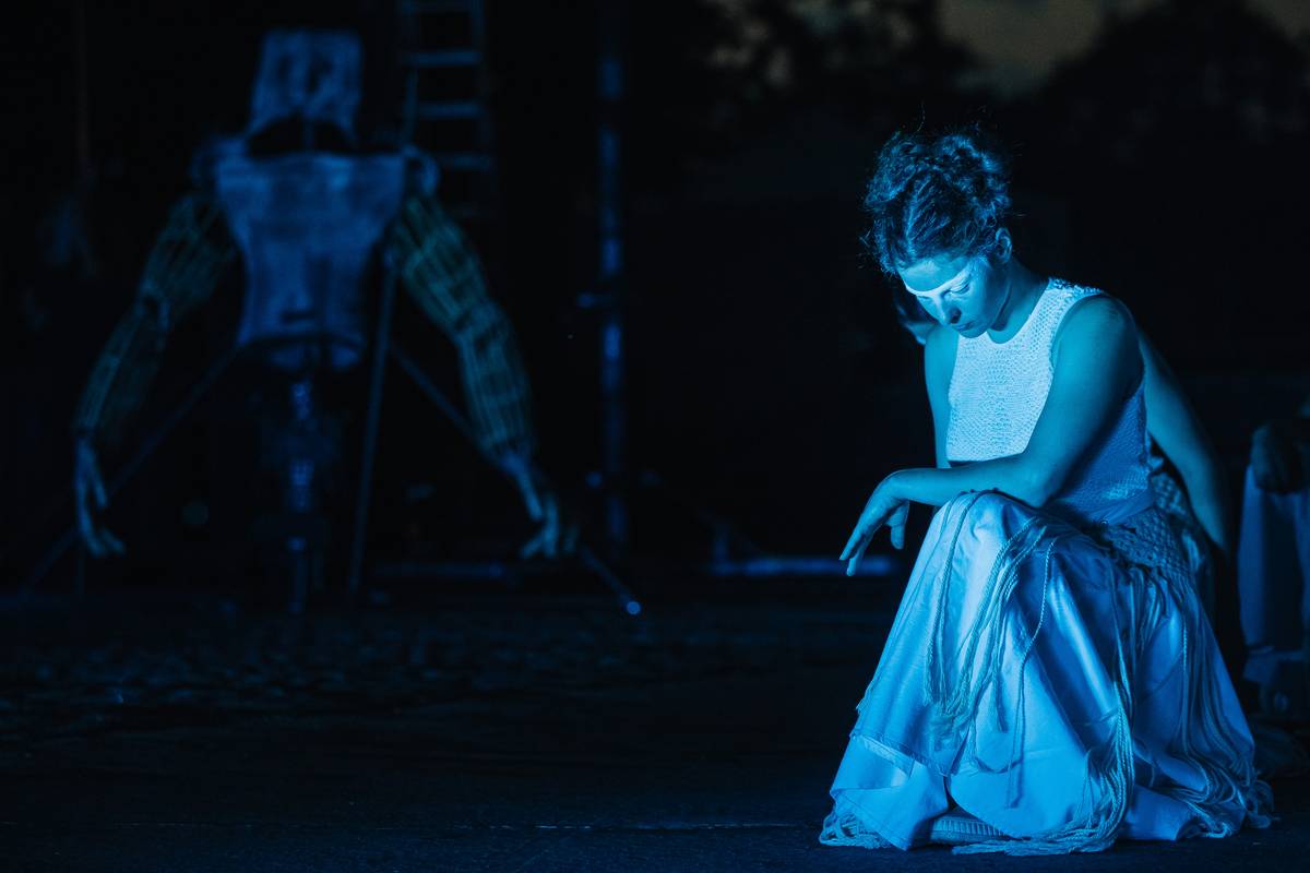 Sedm performerů, včetně tanečnice na chůdách, pak sehrálo pohybové či akrobatické variace na starořecký příběh o nymfě Eurynomé a hadovi Ofiónovi.