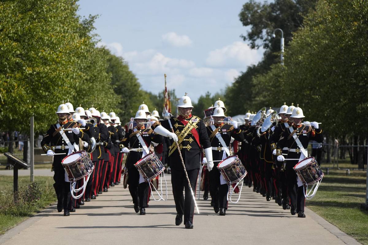 Členové Royal Marines Band Service pochodují v části areálu National Memorial Arboretum.