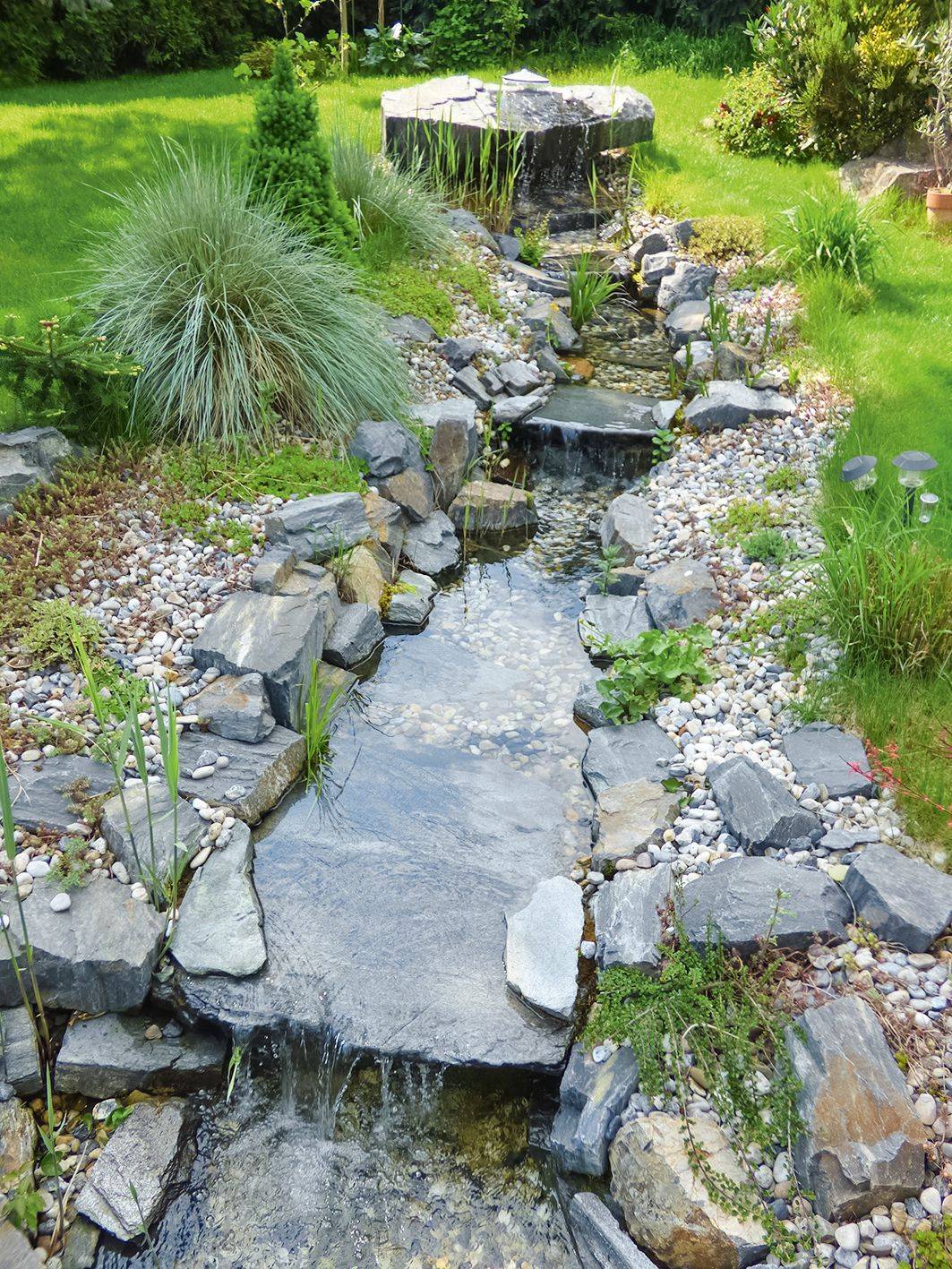 Čerstvě založený potok je zatím hodně syrový, ale v krátkém čase ho vodní a bahenní rostliny zakomponují do zbytku zahrady.