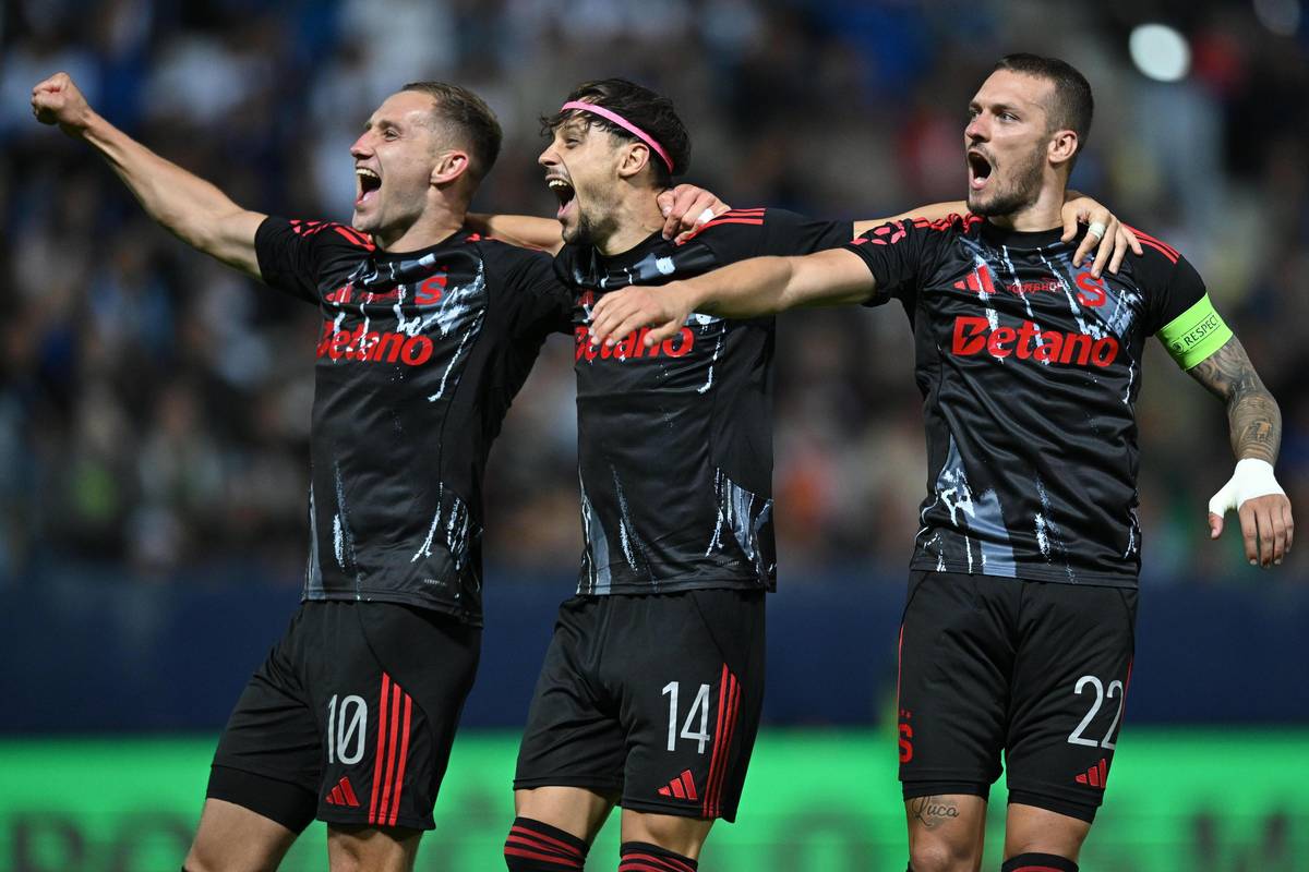 Trojzubec Sparty slaví druhý gól. Zleva Jan Kuchta, Veljko Birmančevič a Lukáš Haraslín.