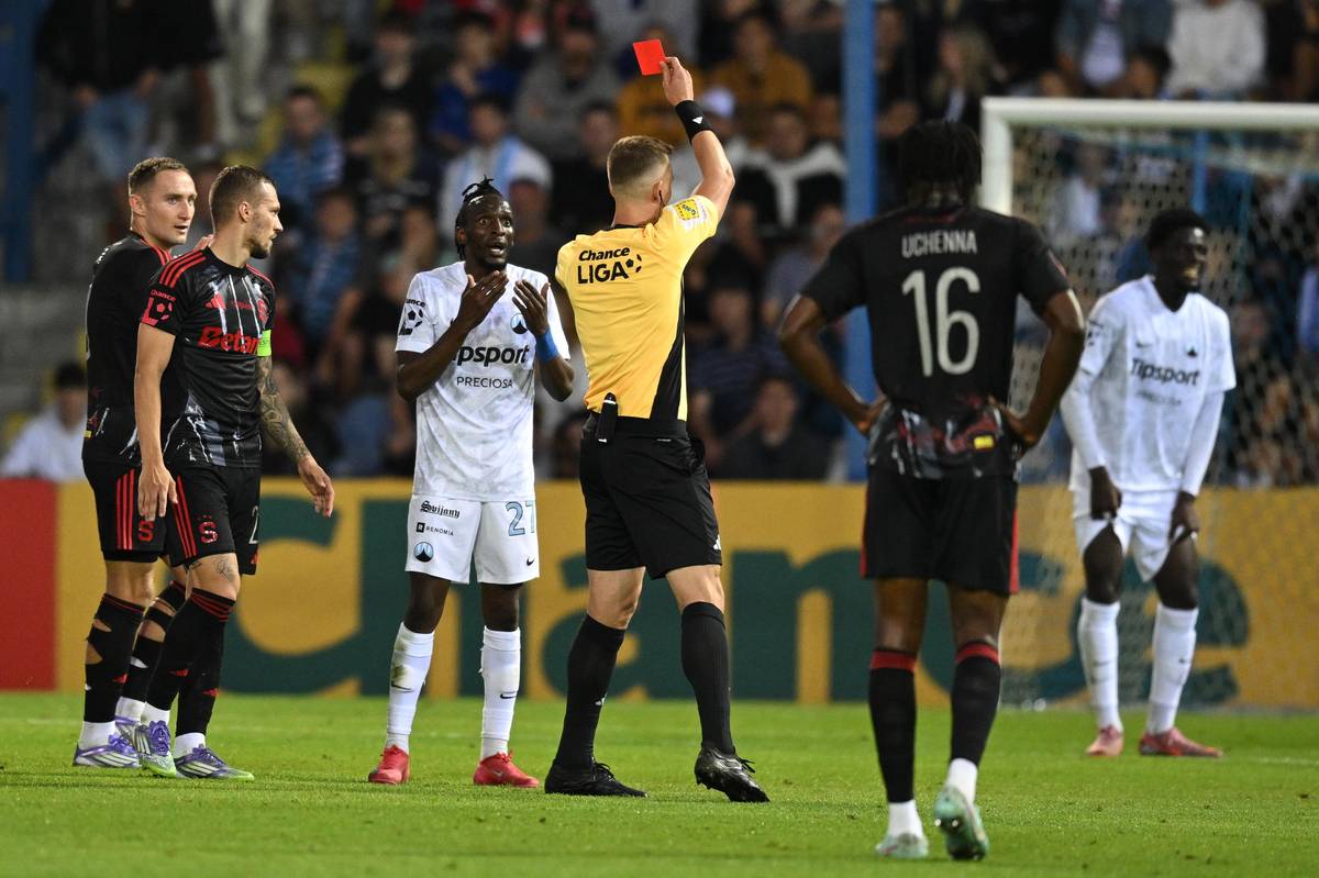 Utkání 5. kola Chance Ligy, FC Slovan Liberec - AC Sparta Praha, Aziz Kayondo musí putovat předčasně do sprch.