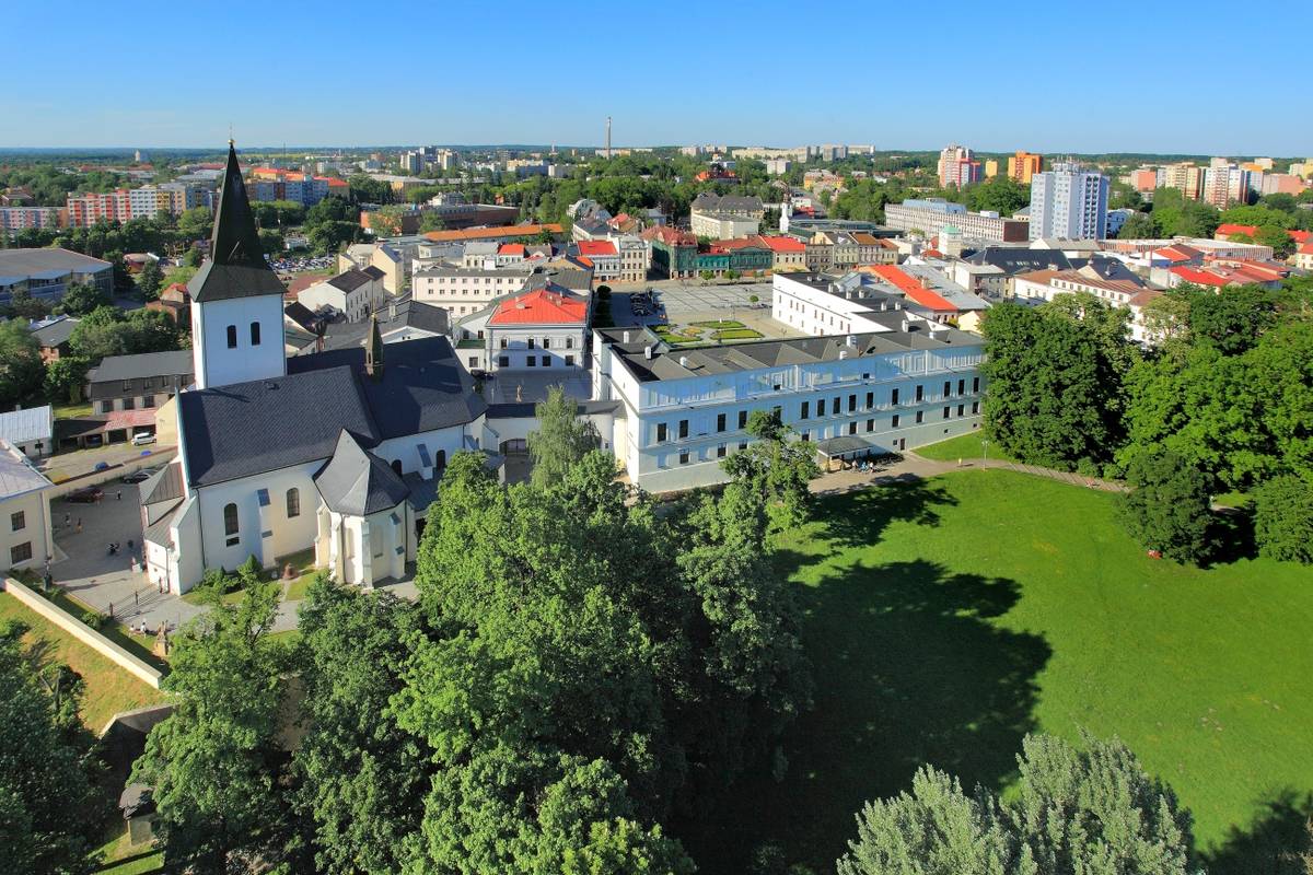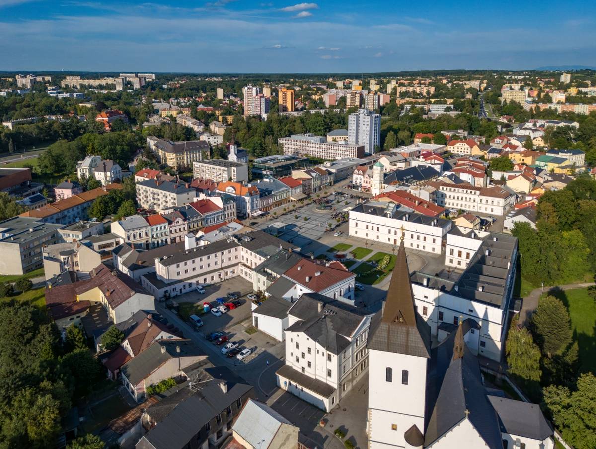 Letecký pohled na zámek Fryštát, kostel Povýšení svatého kříže a karvinské Masarykovo náměstí.