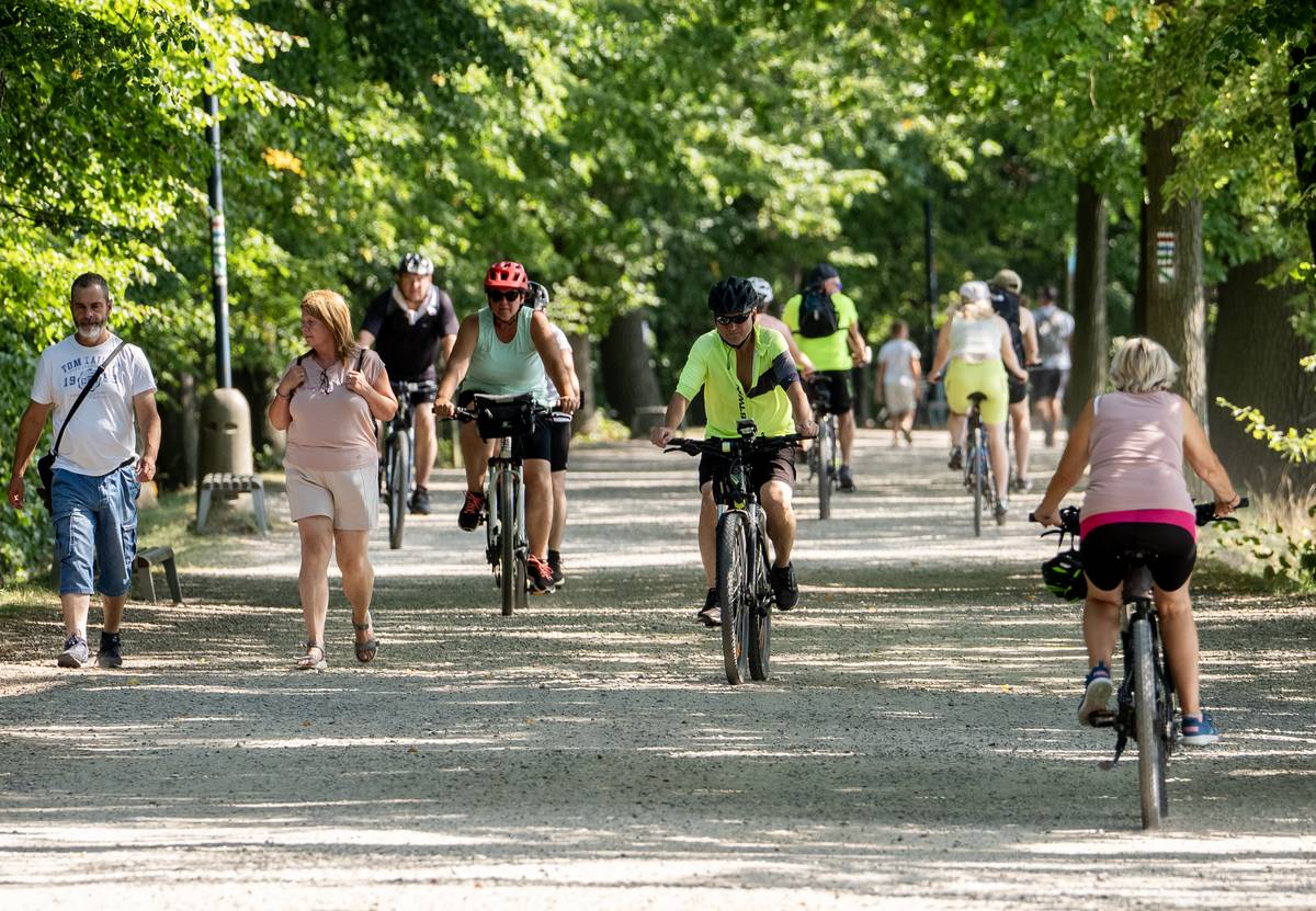 Cyklostezka kolem rybníku Svět. Mísí se zde cykloturisté, výletníci z parníků i vyhlídkový vláček s turisty.