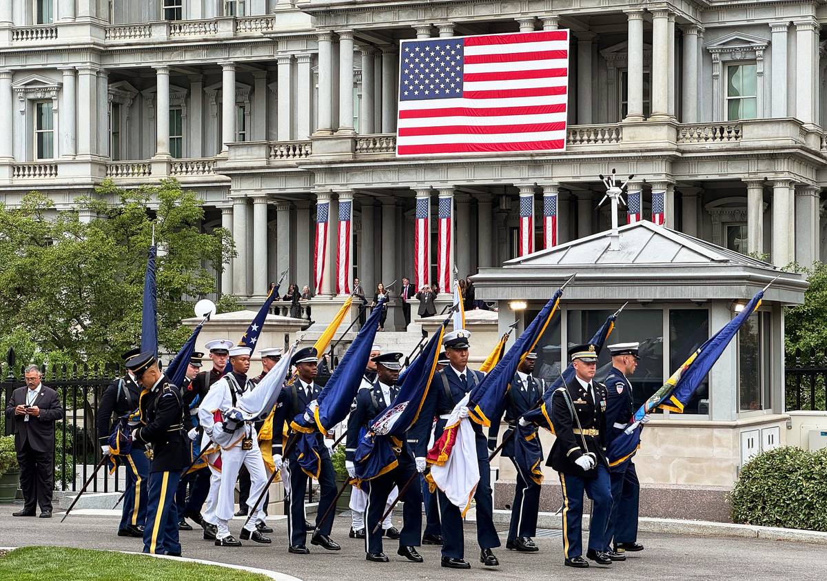 Přípravy na vítání zahraničních politiků. U příležitosti návštěvy státníků je na jižní louce Bílého domu čestná stráž.