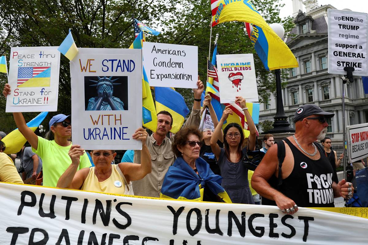 Příznivci Ukrajiny stojí u bezpečnostní zátarasy poblíž Bílého domu ve Washingtonu.