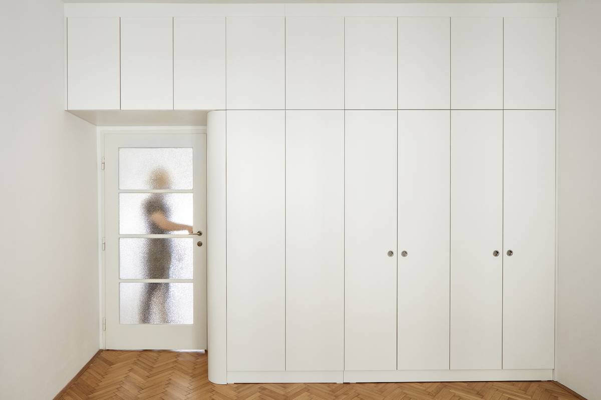 Vestavný nábytek navržený na míru volně cituje geometrické prvky architektury domu.