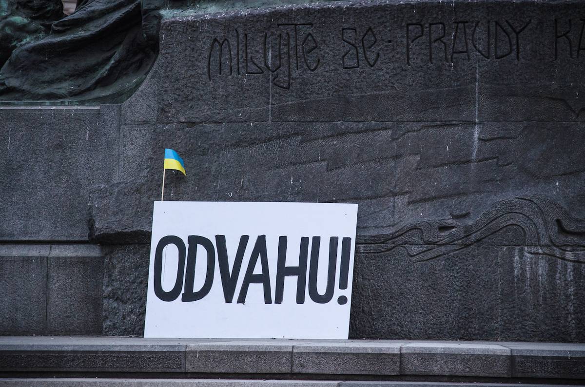 Transparent s nápisem „odvahu“ někdo položil na památník na Staroměstském náměstí, kde se demonstrace konala.