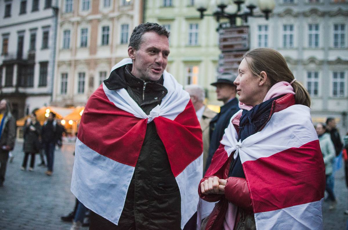 Též se zde objevil pár s běloruskými vlajkami, připomínající tamější protesty z minulého léta.