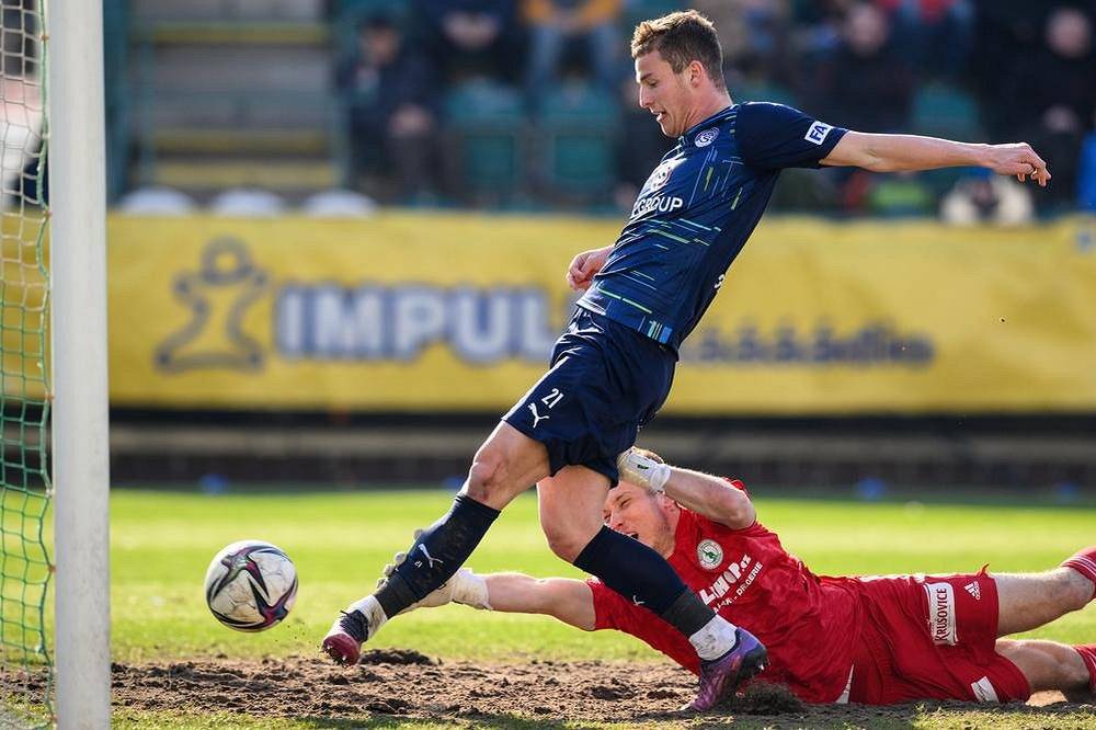 Ondřej Šašinka ze Slovácka překonává brankáře Bohemians Huga Jana Bačkovského.