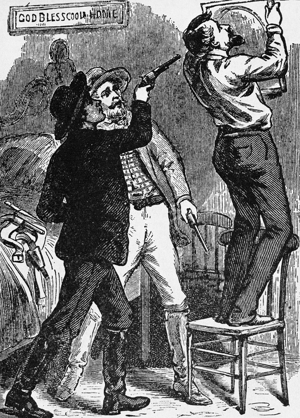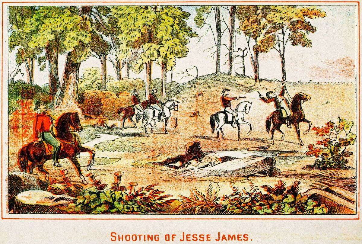 Charles a Bob byli Jesseho poslední nejbližší partneři, kteří se ve skutečnosti nejspíš dali na stranu státních agentů, nebo přinejmenším chtěli podíl na vypsané odměně. Rytina ukazuje scénu, kdy Jesse otáčí hlavu, aby narovnal obraz na stěně, a tím dává Bobovi příležitost vystřelit.