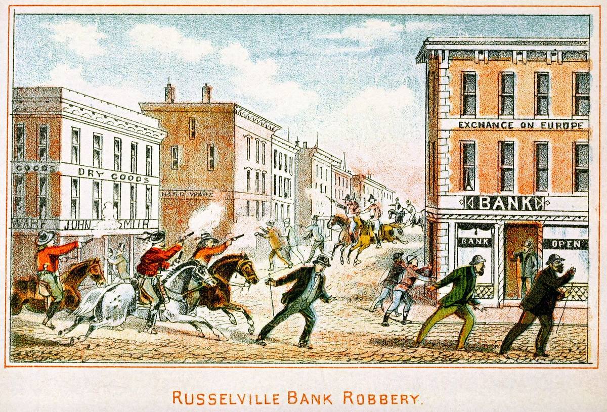 Jednou z jejich prvních loupeží bylo přepadení banky ve státě Kentucky, kde lupiči ukradli v přepočtu asi 260 tisíc korun. Jesse se "proslavil" zabitím nevinného pokladního, o němž si myslel, že byl vrahem jeho velitele z války.