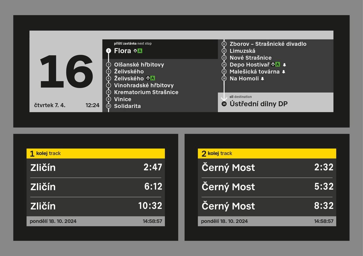 Nový informační systém by se měl nainstalovat i do tramvají, určující barevností jsou tmavé pozadí a bílé informace.