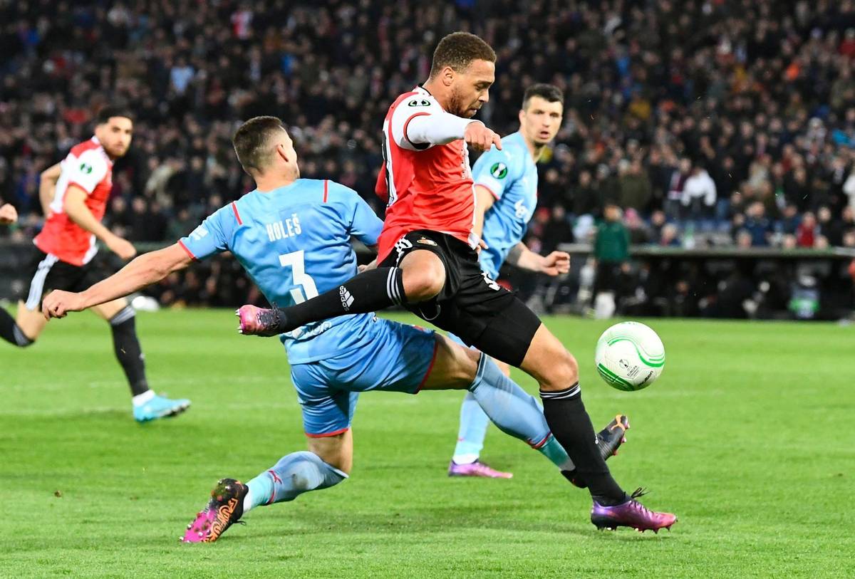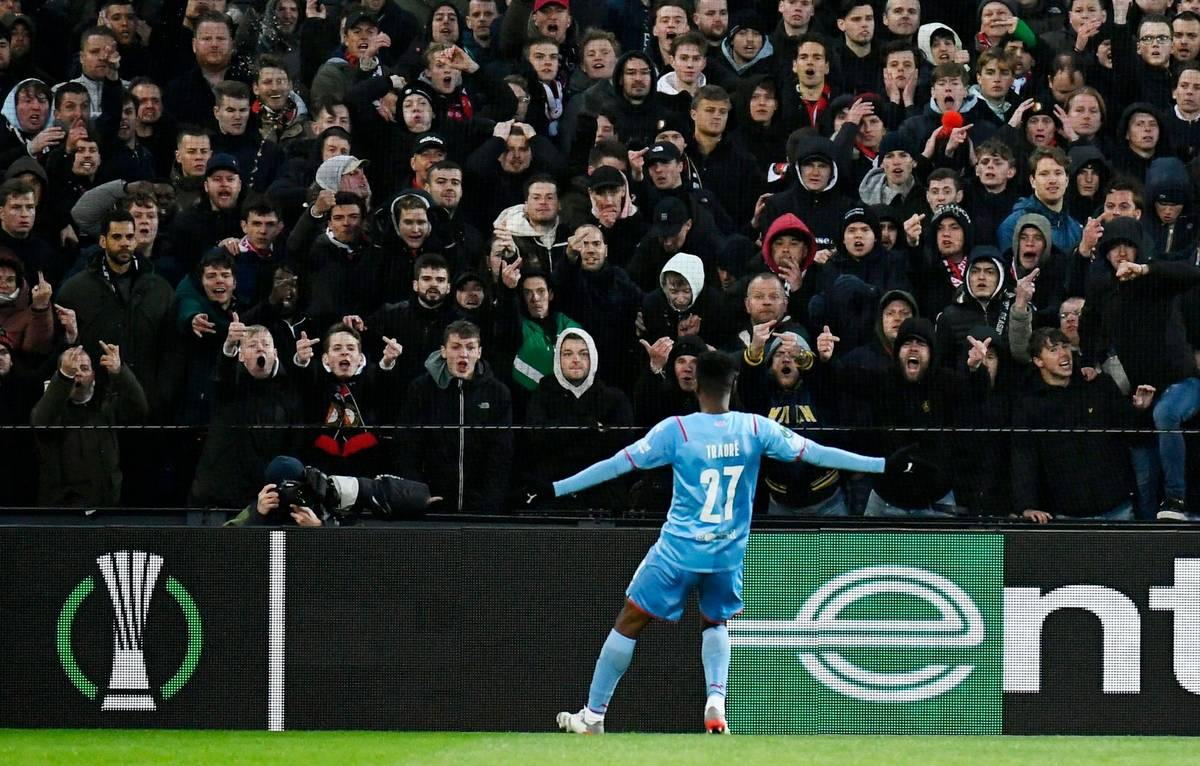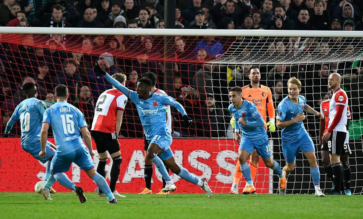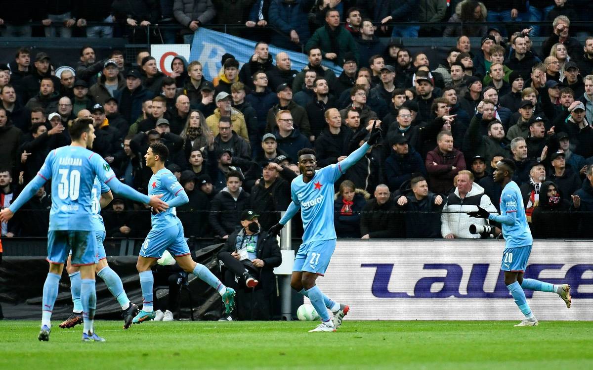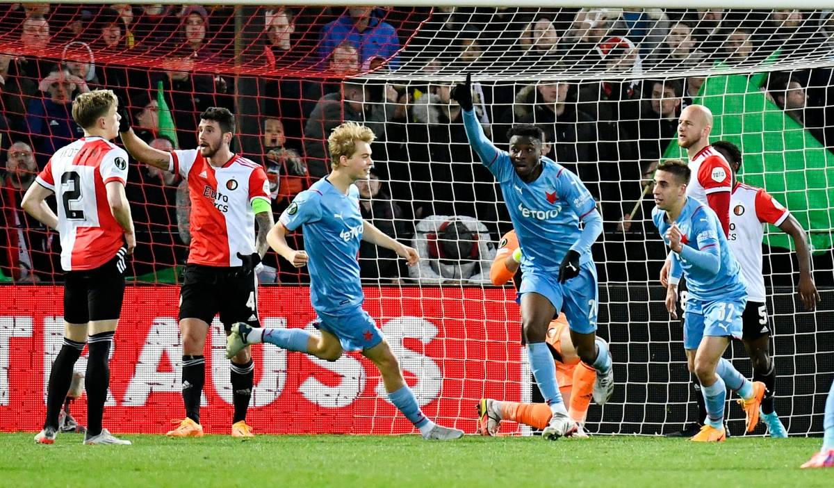 Ibrahim Traoré dává třetí gól v prvním čtvrtfinále Evropské konferenční ligy Feyenoord - Slavia