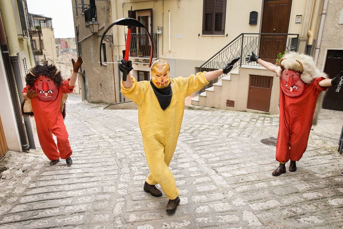 Městečko Prizzi ovládnou o velikonoční neděli červené masky ďáblů a žlutá maska smrti během festivalu Il ballo dei diavoli neboli Tanec ďáblů.