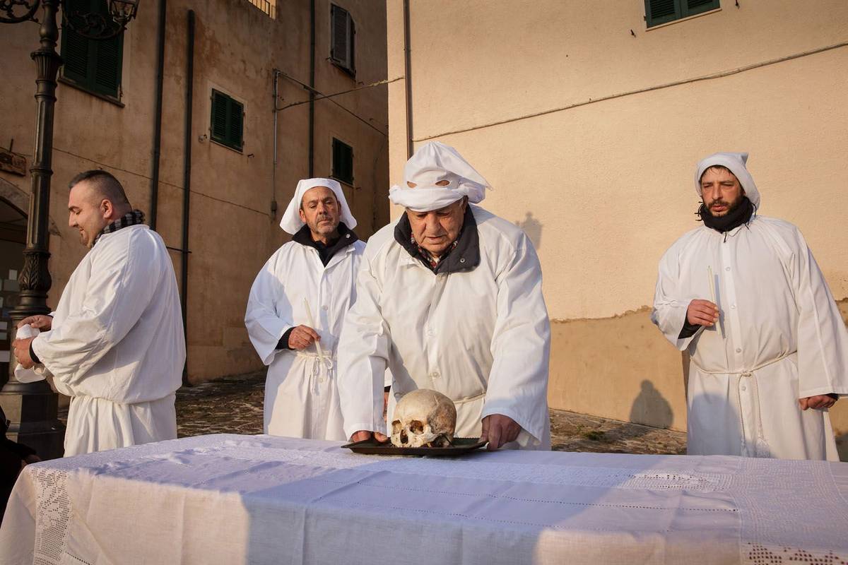 V městečku Castelsardo na Sardinii vynášejí kajícníci před nočním procesím Il Lunissanti z kostela lidskou lebku.