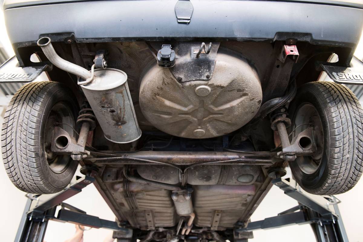 Plášť výfukového tlumiče už je napadený povrchovou oxidací.