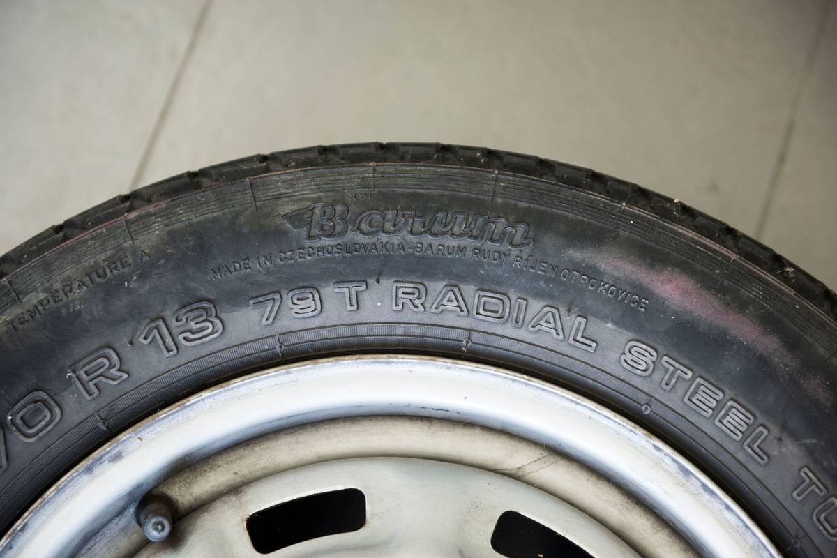 Tak vypadá původní pneumatika z roku 1992. Byla vyrobena ještě v Československu, na vulkanizační formě se dokonce dosud skvěl někdejší název továrny Barum Rudý říjen Otrokovice.