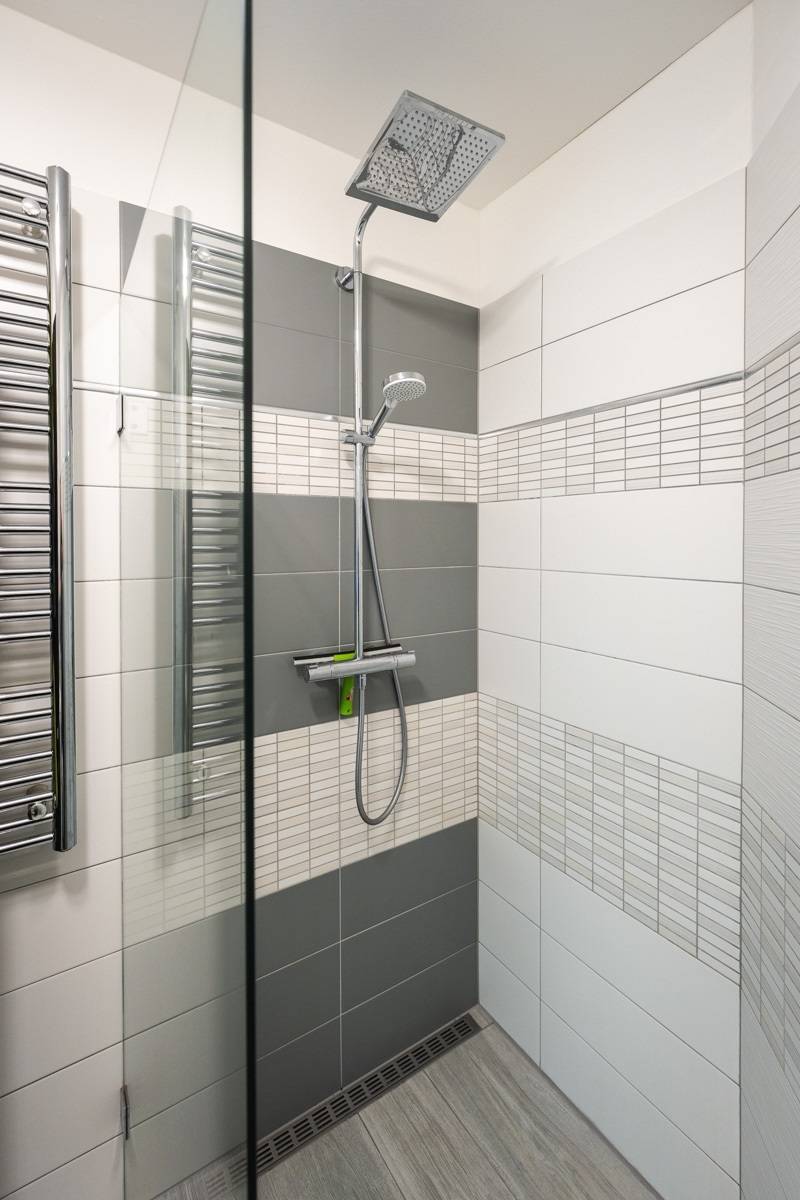 Kromě vany a dvojumyvadla se v koupelně nachází i prostorný sprchový kout.